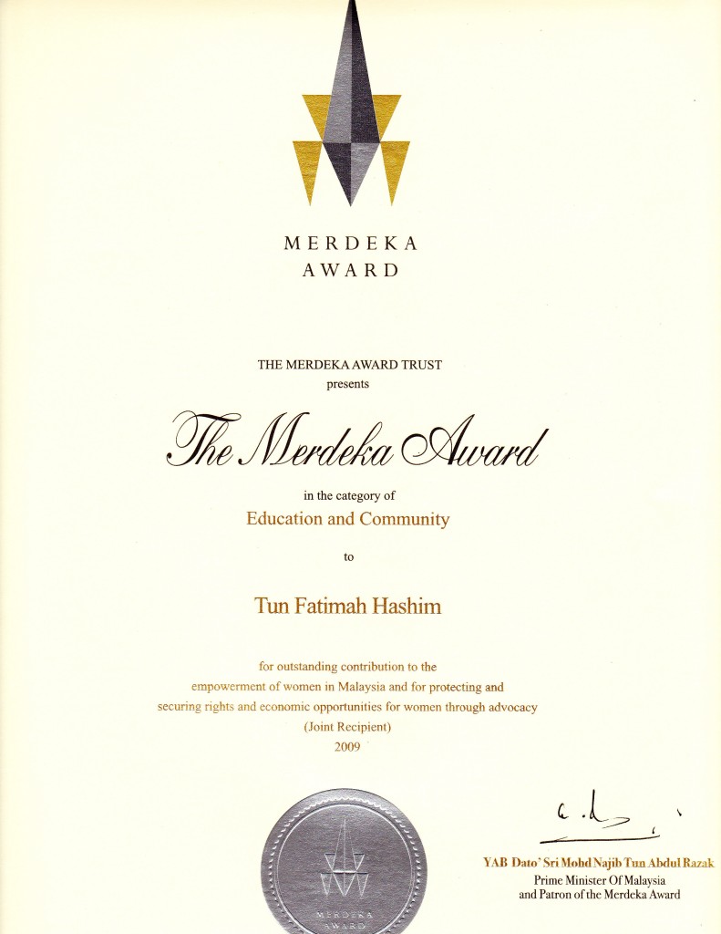- 2009: Anugerah Merdeka – beliau seorang daripada empat rakyat Malaysia yang terkemuka dan cemerlang untuk menerima Anugerah Merdeka bagi kategori Pendidikan dan Komuniti