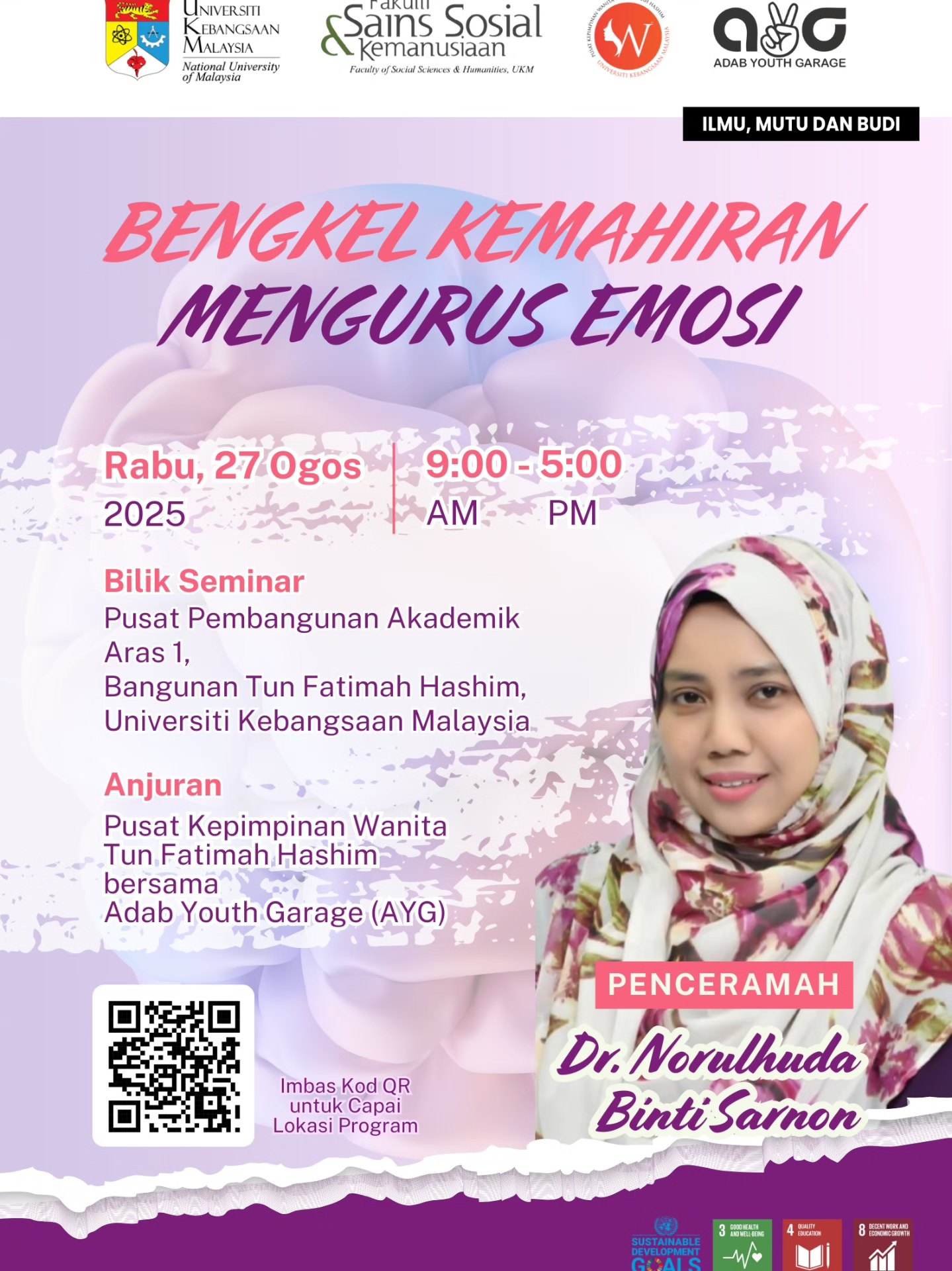 Pada 27 Ogos yang lalu Pusat Kepimpinan Wanita Tun Fatimah Hashim (PKWTFH) telah menganjurkan Bengkel Kemahiran Mengurus Emosi yang disertai oleh para belia daripada Adab Youth Garage (AYG). Aktiviti sepanjang program berlangsung dengan penglibatan aktif para peserta bermula dengan sesi pendaftaran peserta dan ucapan aluan, melawat Galeri Tun Fatimah Hashim di PKWTFH, diikuti slot ceramah bersama Dr. Norulhuda Sarnon, perbincangan interaktif, aktiviti berkumpulan, serta sesi soal jawab yang membina. Program ini diakhiri dengan penyampaian sijil penghargaan peserta dan penceramah. Bengkel ini mendapat sambutan yang amat menggalakkan, ditambah lagi dengan suasana kondusif yang mendorong pembelajaran mereka.
