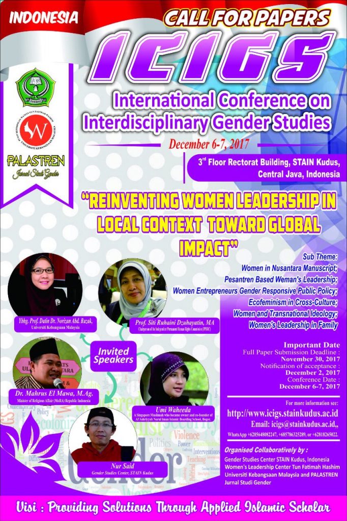 International Conference on Interdisciplinary Gender Studies: Reinventing Women Leadership in Local Context Towards Global Impact “was organized by the Kudus State Islamic Religious High School in collaboration with Tun Fatimah Hashim’s Women’s Leadership Center on 6 December 2017 at the Islamic Religious School of Kudus, Central Java, Indonesia.
