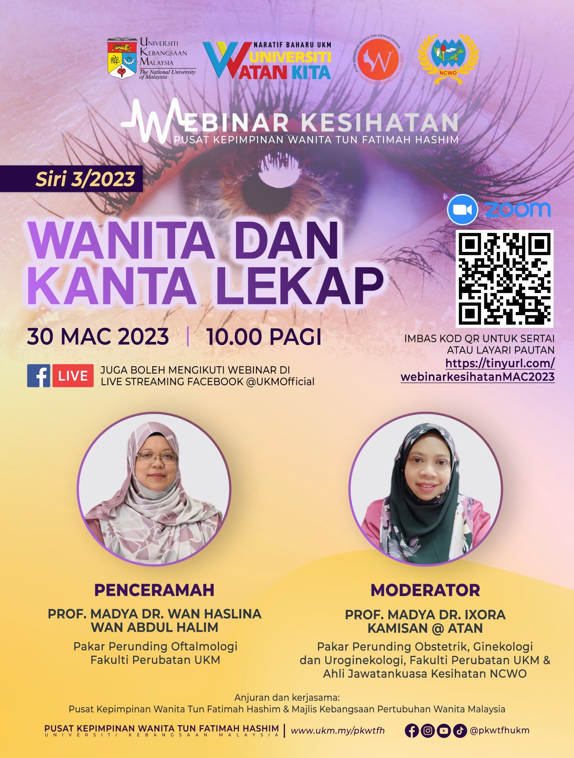 Webinar Kesihatan PKWTFH-NCWO Siri 3/2023 pada bulan Mac ini bertajuk Wanita dan Kanta Lekap akan diadakan secara dalam talian melalui aplikasi Zoom pada ketetapan seperti berikut: