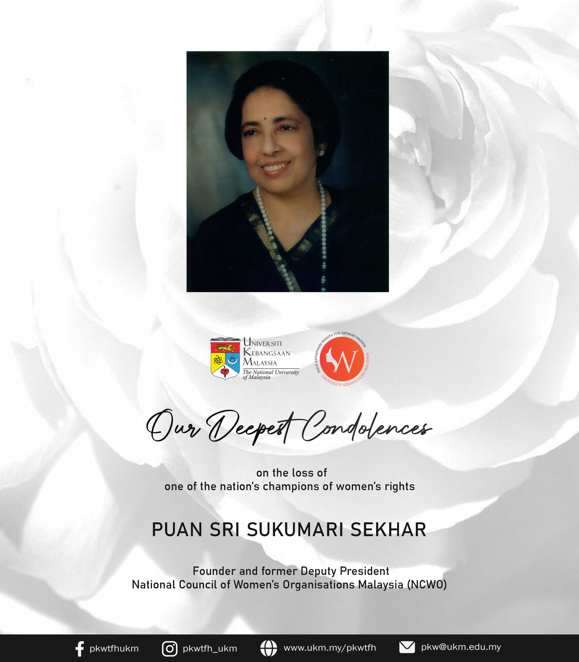 Tun Fatimah Hashim Women’s Leadership Centre entends its condolences and grief over the loss of nation’s champions of women’s rights, Puan Sri Sukumari Sekhar who passed away at Cardiac Vascular Sentral Kuala Lumpur (CVSKL) on 8 March 2021.