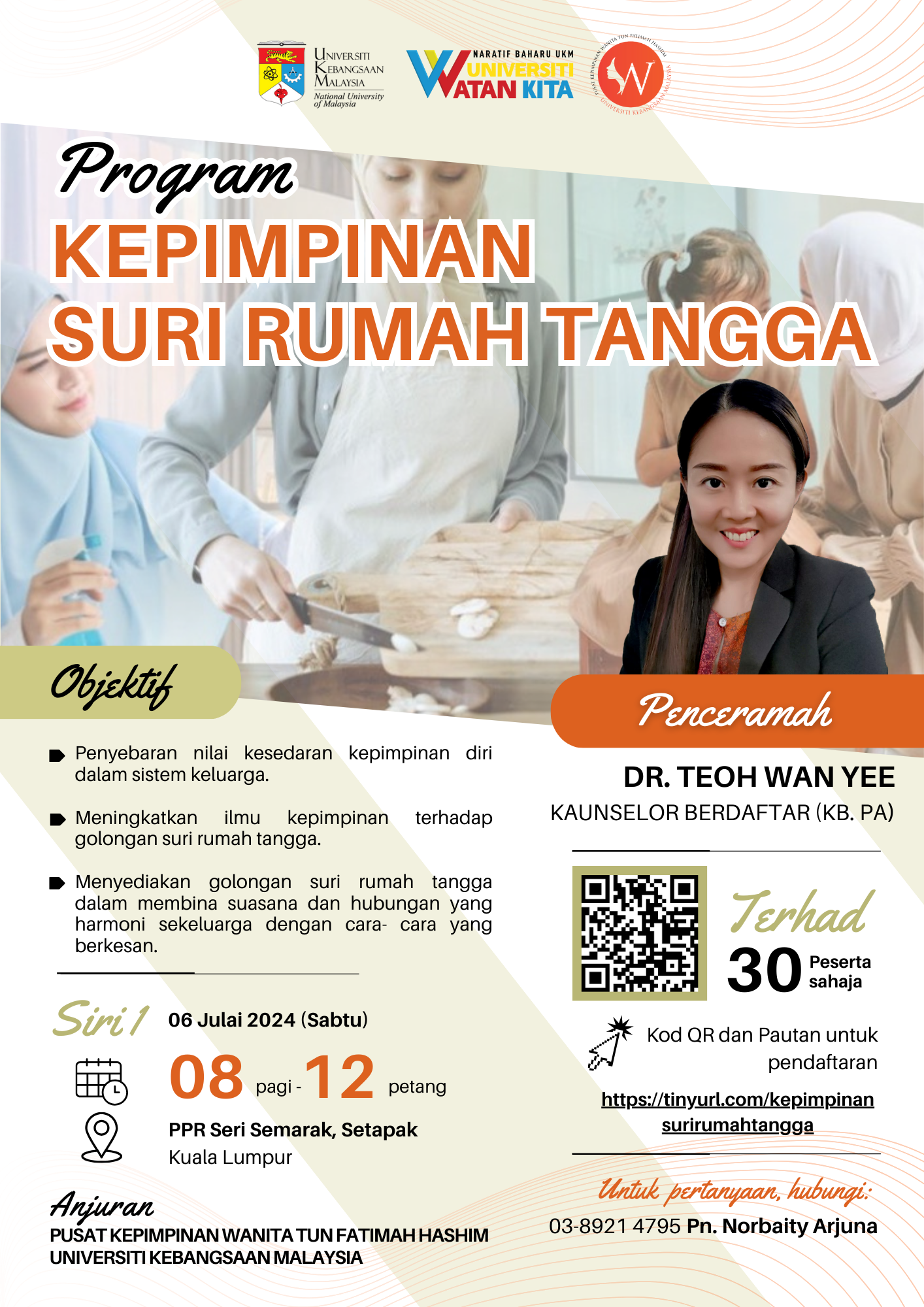 Pusat Kepimpinan Wanita Tun Fatimah Hashim akan menganjurkan Program Kepimpinan Suri Rumah Tangga pada 6 Julai 2024 ini, bertempat di PPR Seri Semarak, Setapak, Kuala Lumpur. Program ini bertujuan untuk menyebarkan nilai kesedaran kepimpinan dalam sistem kekeluargaan, meningkatkan ilmu kepimpinan, dan menyediakan pembinaan suasana serta hubungan harmoni kekeluargaan dalam kalangan suri rumah tangga dengan cara yang lebih berkesan.