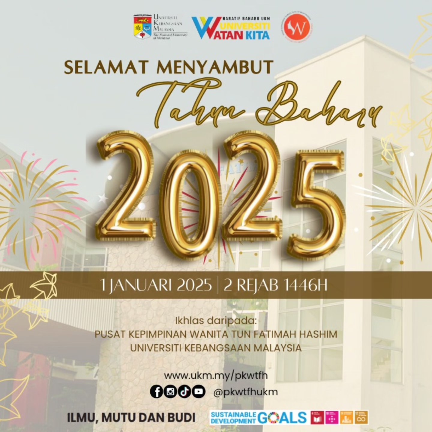 Seluruh warga Pusat Kepimpinan Wanita Tun Fatimah Hashim, UKM mengucapkan Selamat Tahun Baharu 2025 kepada semua. Diharapkan semoga pada tahun ini, kita beroleh lebih kejayaan , kebitaraan dan kecemerlangan khasnya buat warga UKM.