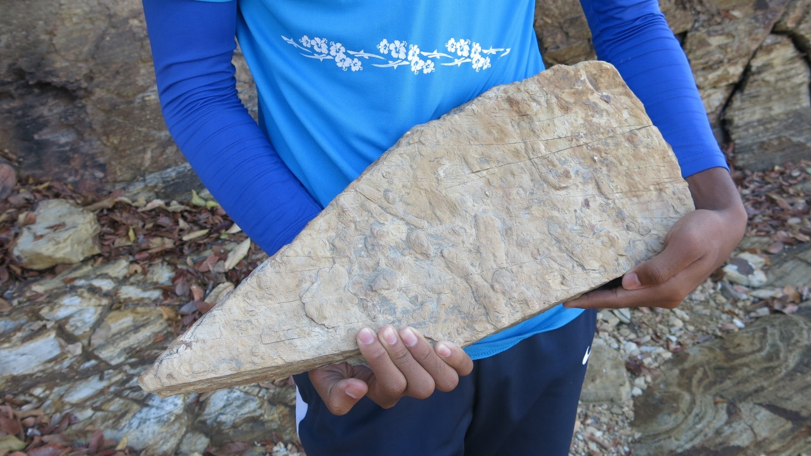 Persampelan fosil surih (ichnofossil) batuan pasir Formasi Singa di Pulau Ular.
