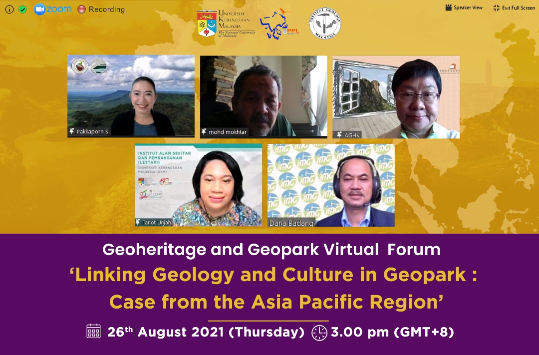 Geoheritage and Geopark Virtual Forum telah berjaya dilaksanakan pada 26 Ogos 2021. Rakaman perjalanan forum tersebut boleh didapati pada pautan berikut: https://www.youtube.com/watch?v=EMRpPYSCGoM