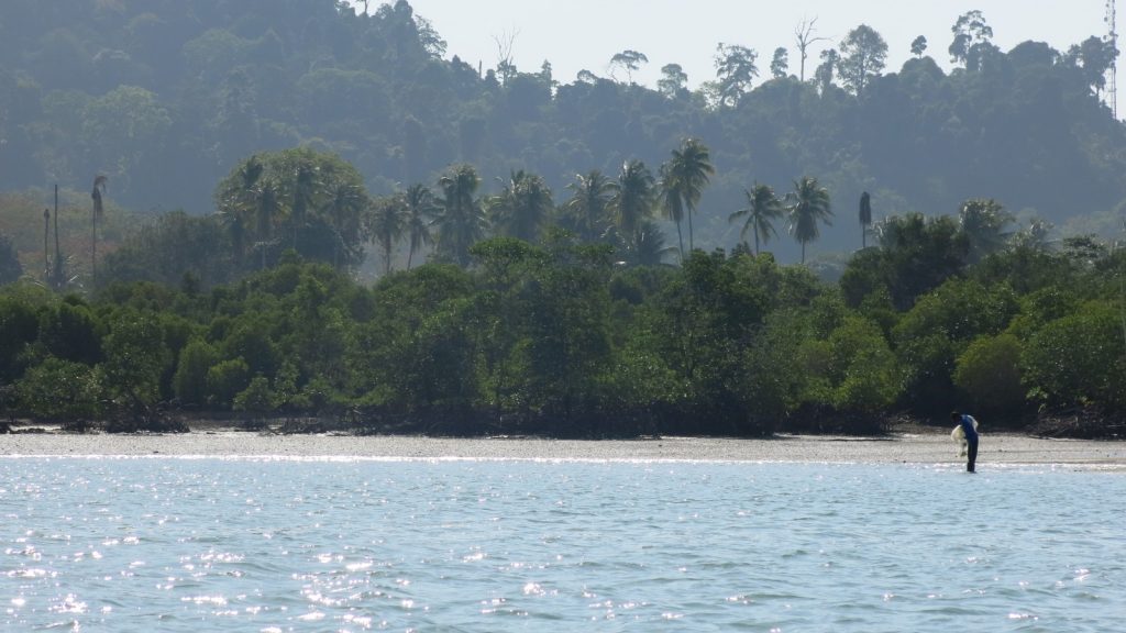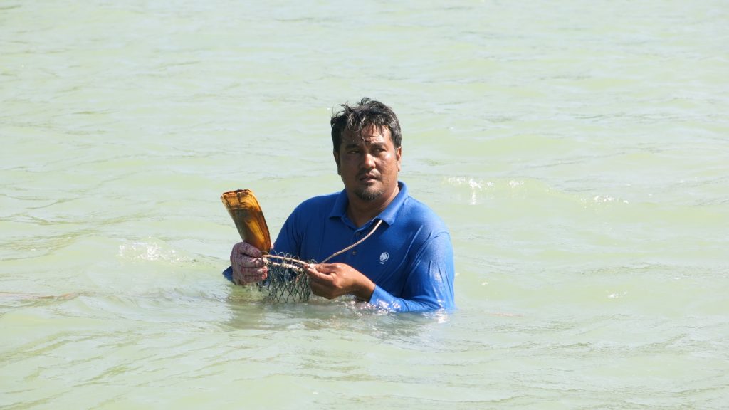 Seorang nelayan tempatan menyelam bagi mencari siput peha ayam.