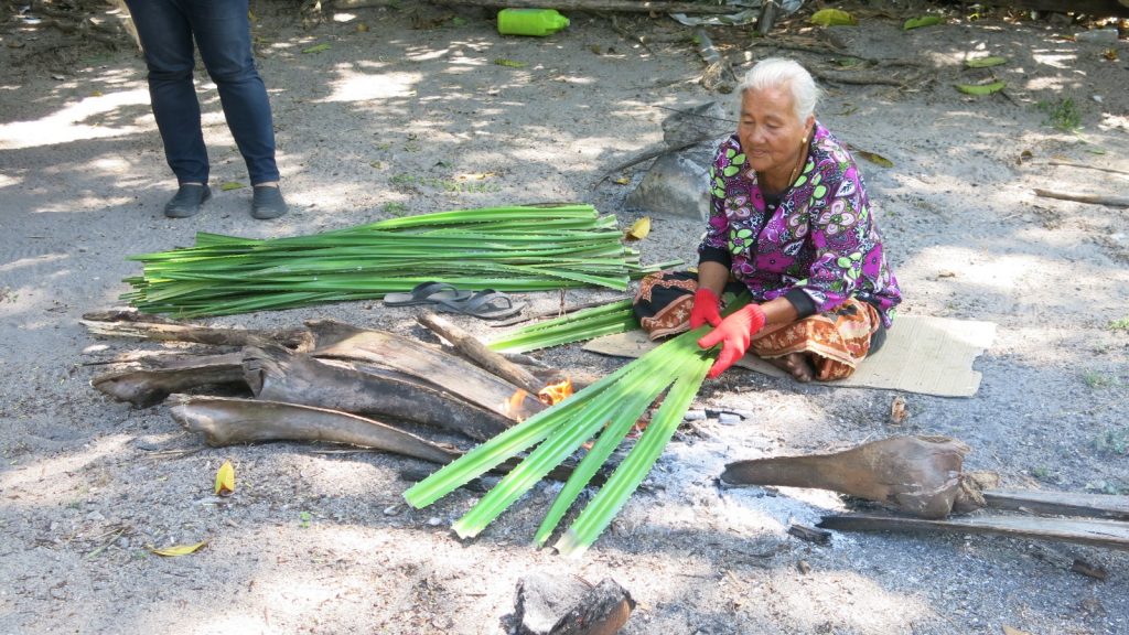 Seorang penduduk tempatan memproses daun mengkuang bagi pembuatan tikar, bakul dan beg berasaskan daun mengkuang.