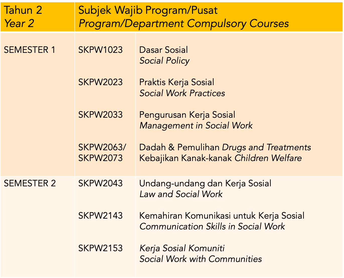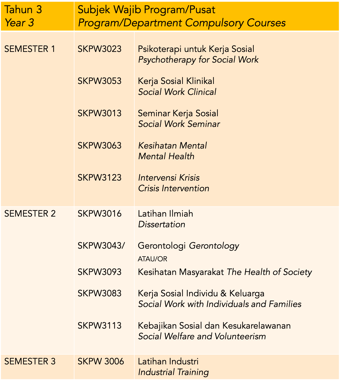 Industrial training is compulsory. It is a student placement in an industry or outside organisation (locally or abroad) that offer social services for a period of 8 weeks.