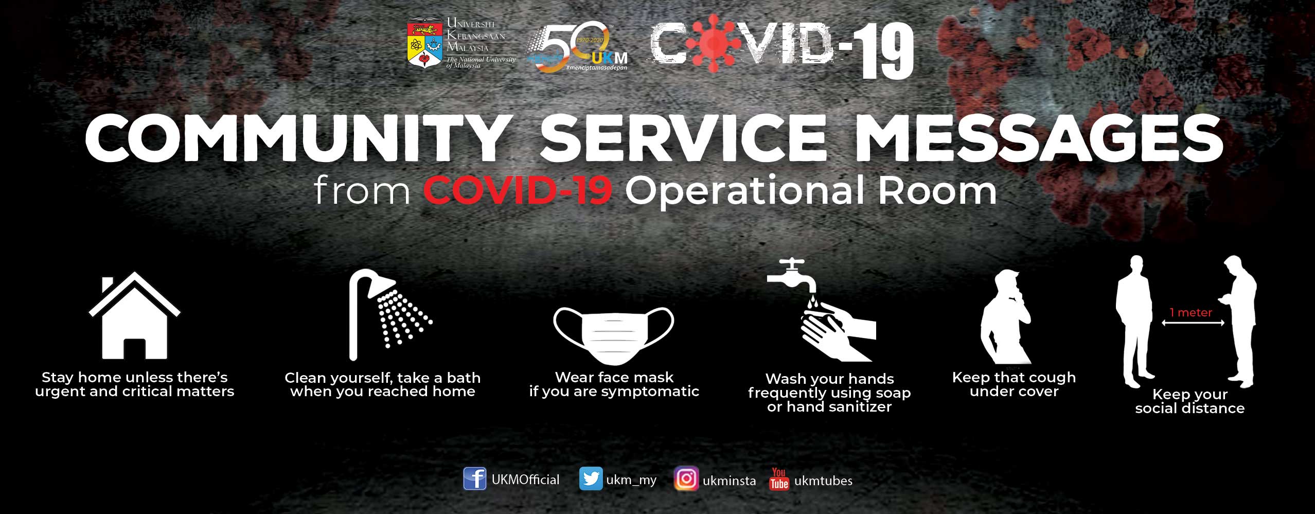 UKM is closely monitoring the situation and responding to the measures taken to combat Covid-19, and liaising with government and the Ministry of Health to get their latest advice on public health guidance. Our top priority is the health and safety of our students and staff. Following the restrictions imposed by Malaysian Government, only essential-services should be operating on campus. To ensure teaching and learning for all programmes continue to be delivered as planned, UKM has activated the e-learning mode for all classes and postponed out-of-campus activities.