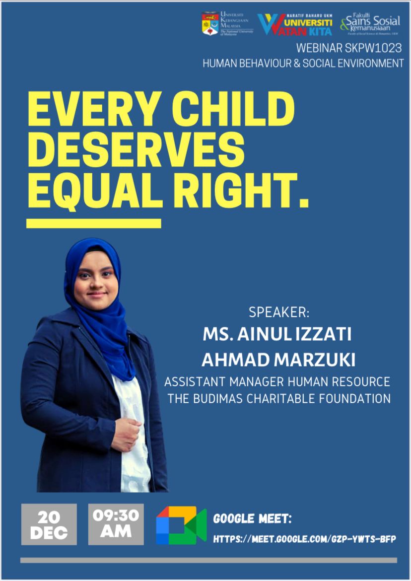 All children are born equal. They are entitled to equality in human dignity and with equal rights to fully develop their cognitive and human potential. Nonetheless, they are not born into equal circumstances. This webinar aims to explain these circumstances. A speaker from The Budimas Charitable Foundation was invited to share some insights on the welfare and the well-being of orphans and underprivileged children in Malaysia. A total of 39 social work students were participated and actively engaged during the webinar.