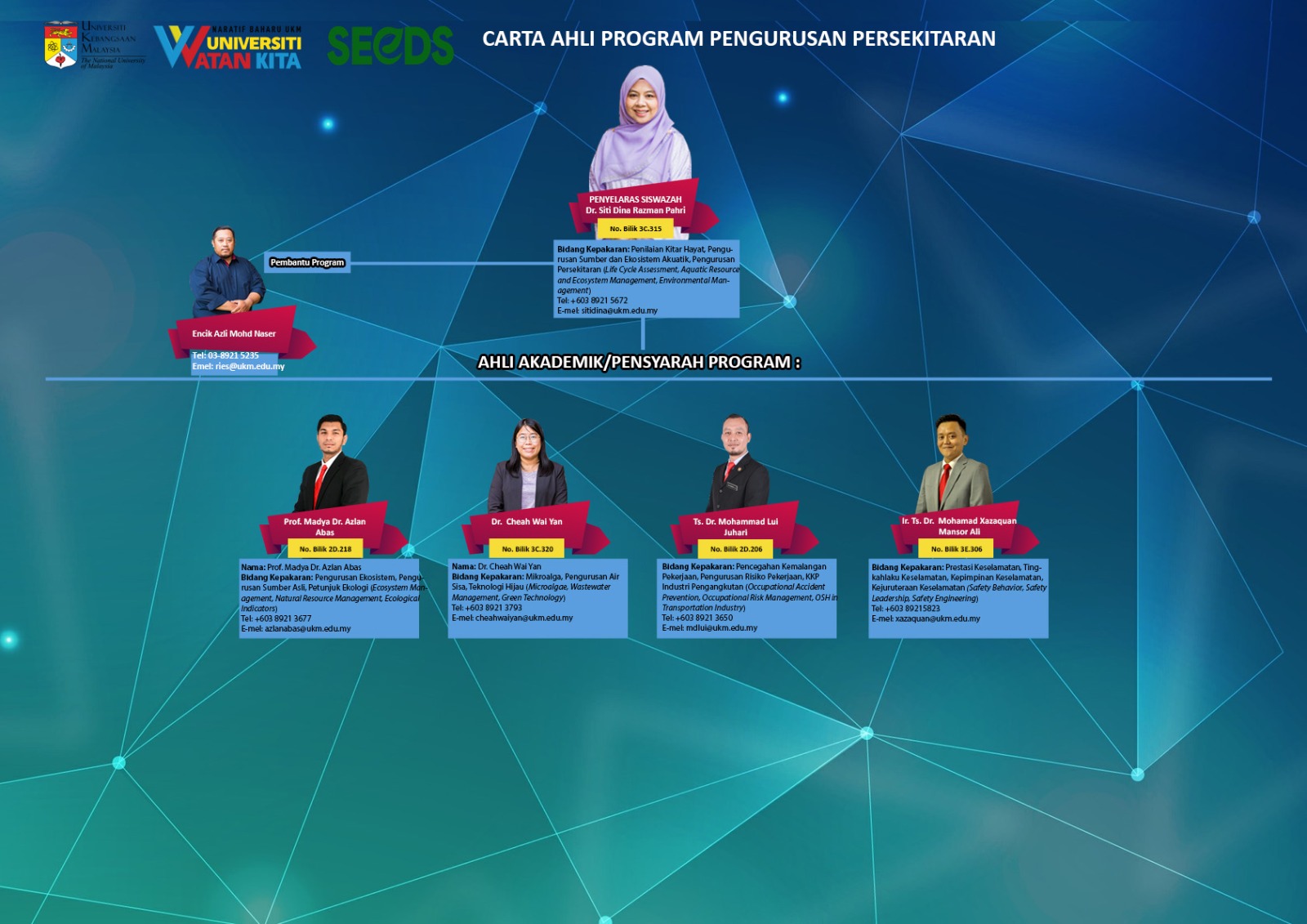 Program ini ditawarkan pada peringkat Sarjana Kerja Kursus, Sarjana Falsafah dan Doktor Falsafah, sekaligus menyediakan laluan akademik dan profesional yang fleksibel. Ia amat sesuai untuk lepasan graduan yang ingin menambah kemahiran serta memperluas prospek kerjaya, dan juga bagi individu yang sedang bekerja yang mahu meningkatkan kepakaran profesional mereka untuk menghadapi cabaran pengurusan persekitaran dalam sektor awam, swasta dan industri.