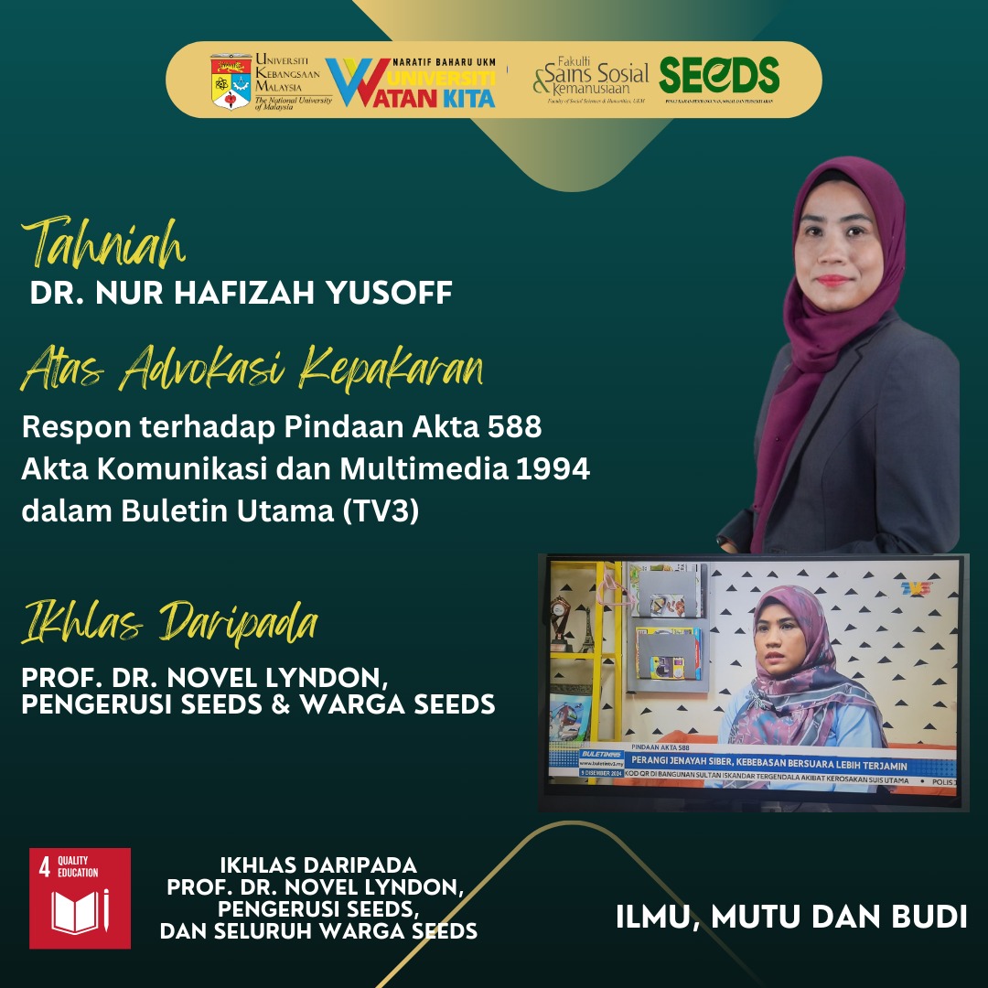 Tahniah diucapkan kepada YBrs. Dr. Nur Hafizah Yusoff, Ketua Program Antropologi dan Sosiologi di Pusat Kajian SEEDS. Mengutarakan pandangan semasa di temuramah wartawan Buletin Utama TV3 tentang respon terhadap Pindaan Akta 588 Akta Komunikasi dan Multimedia 1994 dalam Buletin Utama (TV3) pada 9 Disember 2024 yang lalu.