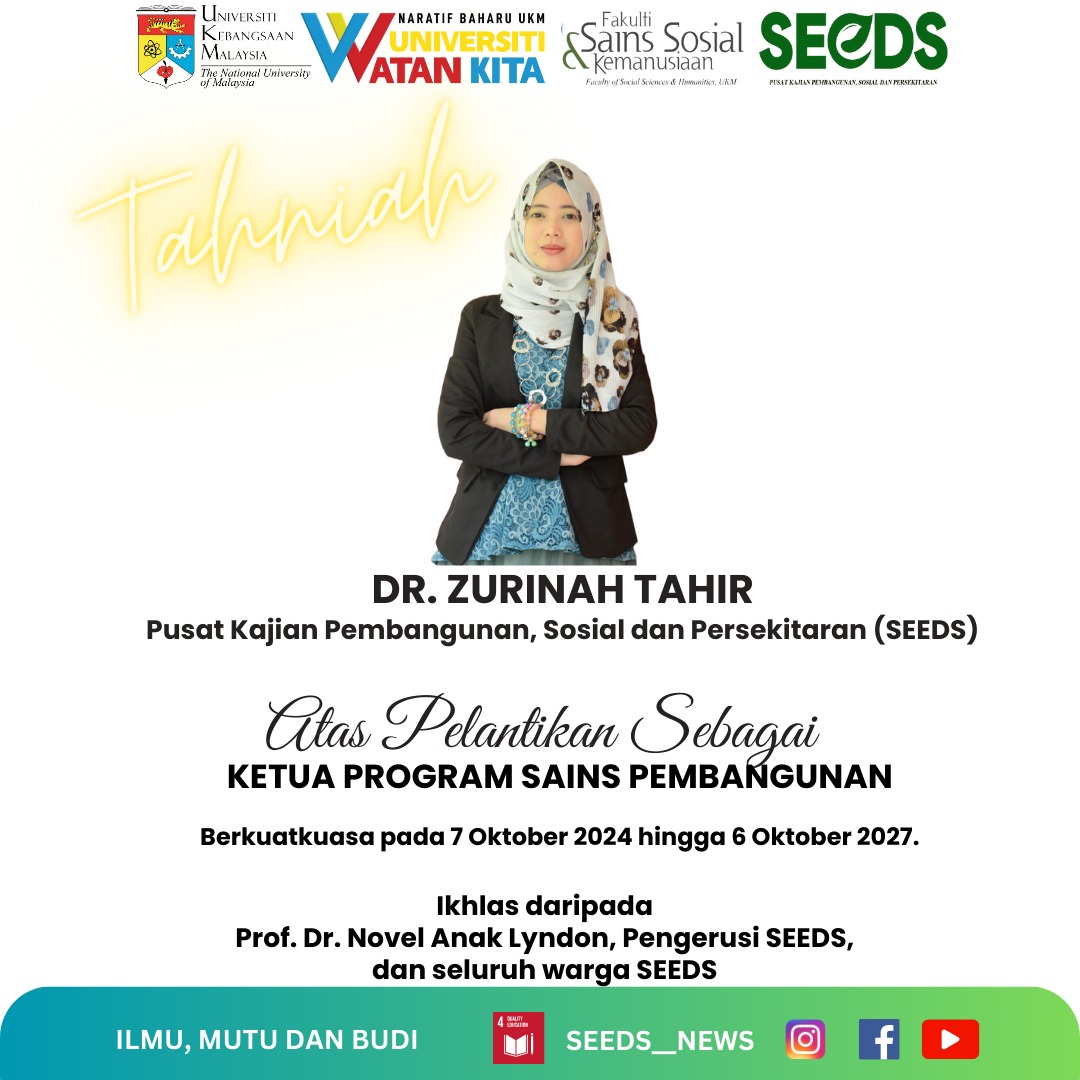 sebagai Ketua Program Sains Pembangunan di Pusat SEEDS, FSSK untuk tempoh tiga (3) tahun mulai 7 Oktober 2024 hingga 6 Oktober 2027.