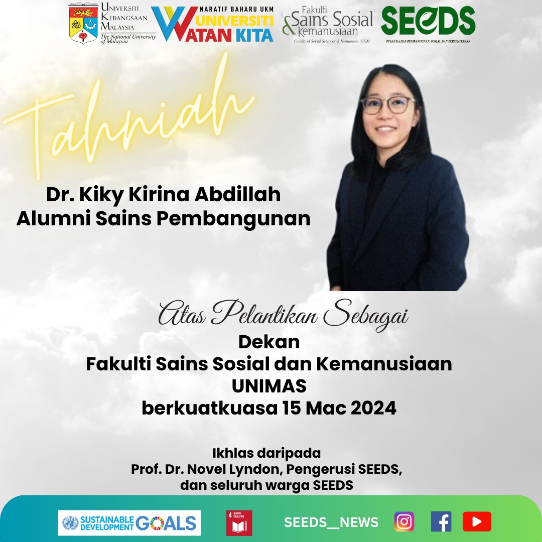 Warga Pusat Kajian SEEDS mengucapkan jutaan Tahniah kepada YBrs. Dr. Kiky Kirina Abdillah, beliau merupakan Alumni Program Sains Pembangunan di Pusat Kajian SEEDS atas Pelantikan sebagai Dekan Fakulti Sains Sosial & Kemanusiaan di Universiti Malaysia Sarawak (UNIMAS) berkuatkuasa pada 15 Mac 2024. Semoga terus cemerlang .