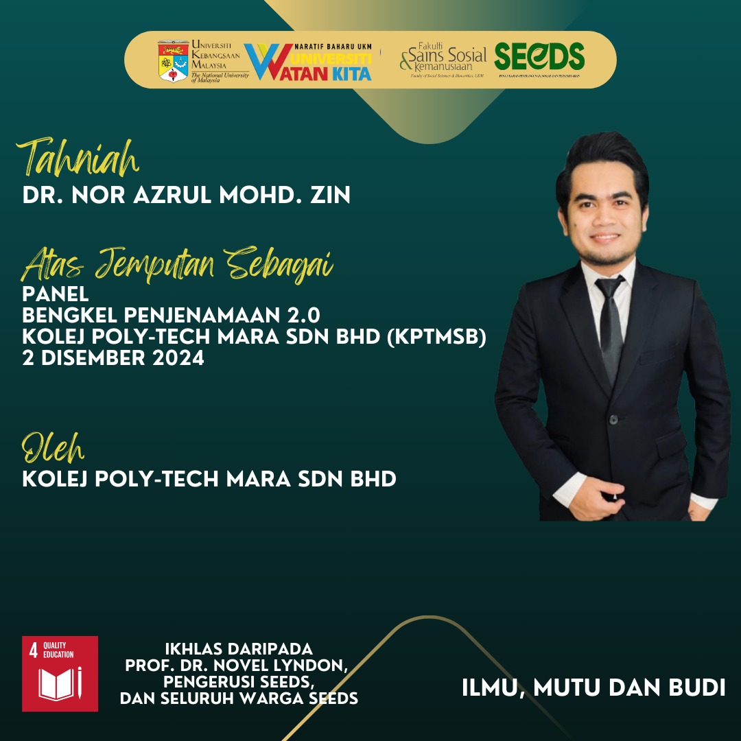 Setinggi-tinggi tahniah diucapkan kepada YBrs. Dr. Nor Azrul bin Mohd Zin, kerana dilantik sebagai Panel bagi Bengkel Penjenamaan 2.0 oleh Kolej Poly-Tech Mara Sdn. Bhd pada 2 Disember 2024. Semoga terus cemerlang dan maju jaya.