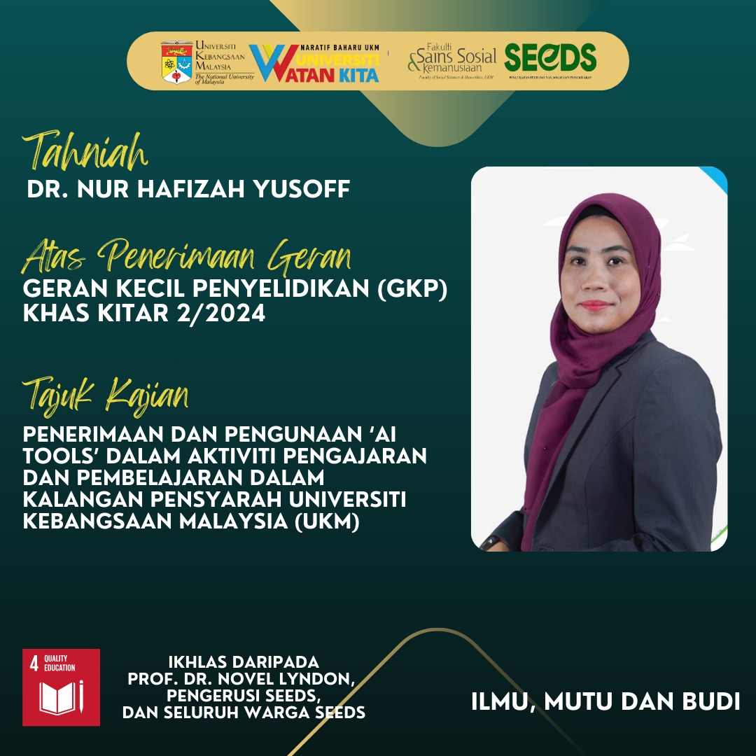 “TAHNIAH KEPADA DR. NUR HAFIZAH YUSOFF” Setinggi-tinggi tahniah diucapkan kepada YBrs. Dr. Nur Hafizah Yusoff, kerana berjaya memperoleh Geran Kecil Penyelidikan (GKP) Khas Kitar 2/2024. Semoga terus cemerlang dan maju jaya. ILMU, MUTU DAN BUDI