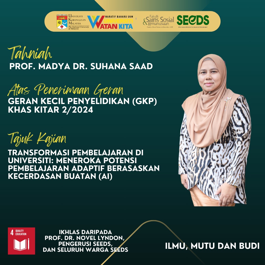 Setinggi-tinggi tahniah diucapkan kepada YBrs. Prof. Madya Dr. Suhana Saad, kerana berjaya memperoleh Geran Kecil Penyelidikan (GKP) Khas Kitar 2/2024.