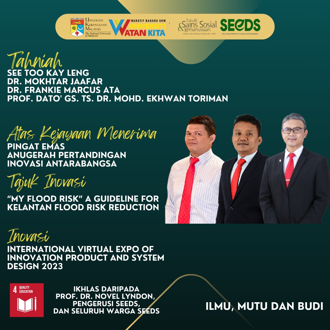 Setinggi-tinggi tahniah diucapkan kepada kumpulan penyelidikan yang terdiri daripada YBhg. Prof. Dato’ Gs. Ts. Dr. Mohd. Ekhwan Toriman, YBrs. Dr. Mokhtar Jaafar dan Dr. Frankie Marcus Atas , kerana telah memenangi Pingat Emas dalam beberapa siri pertandingan peringkat antarabangsa iaitu International Virtual Expo of Innovation Product and System Design 2023 & 2021. Moga terus cemerlang dan maju jaya.
