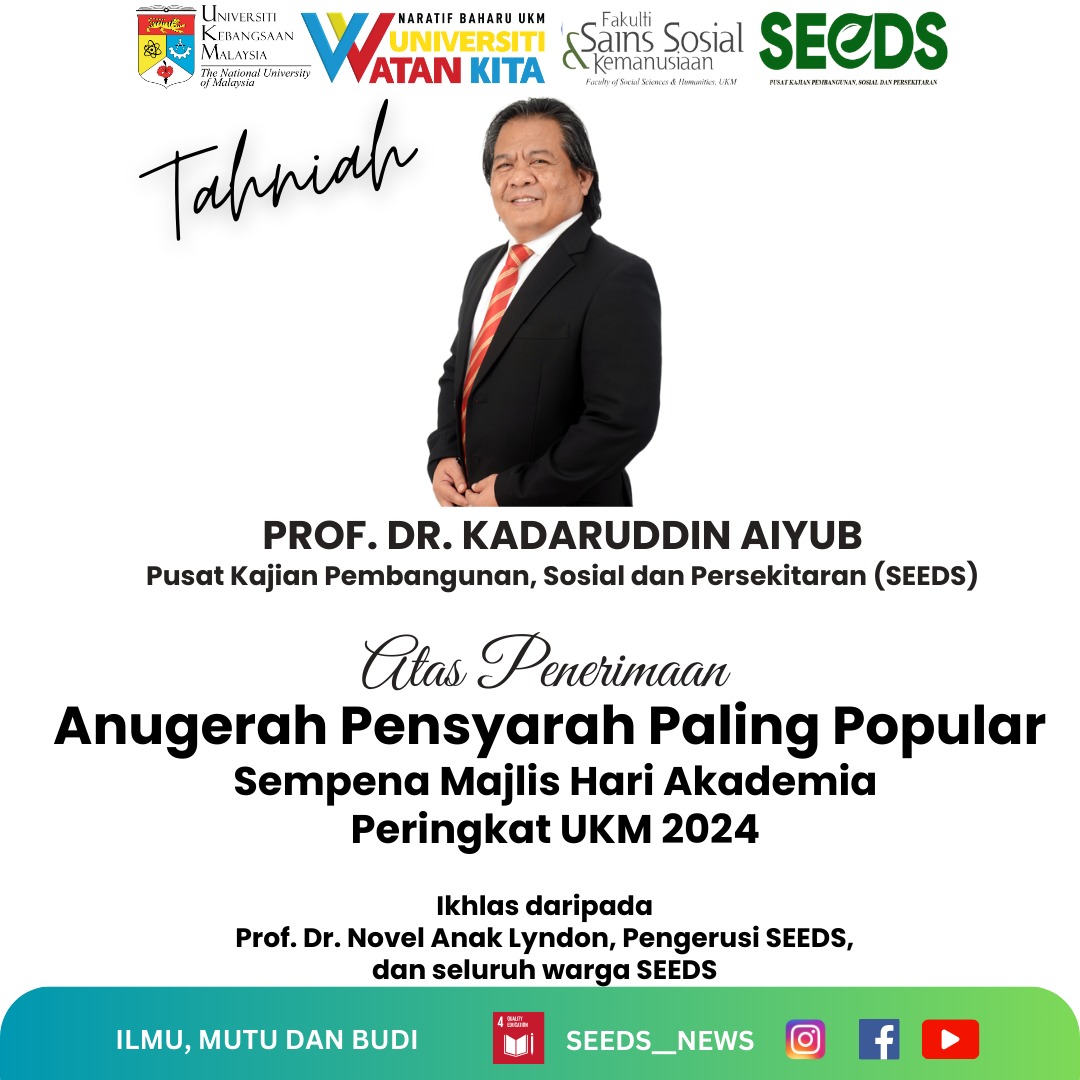 “TAHNIAH PROF. DR. KADARUDDIN AIYUB” Tahniah diucapkan kepada Prof. Dr. Kadaruddin Aiyub atas Penerimaan Anugerah Pensyarah Paling Popular, Semperna Majlis Hari Akademia Peringkat UKM 2024, Moga terus cemerlang dan maju jaya.