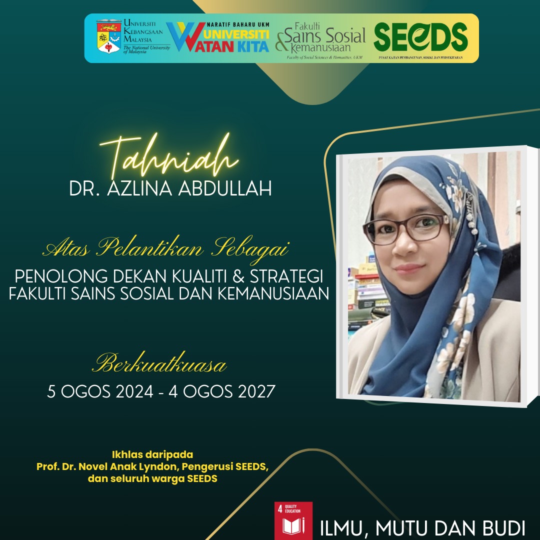 Warga Pusat Kajian Pembangunan, Sosial dan Persekitaran (SEEDS) mengucapkan Tahniah kepada Dr. Azlina Abdullah atas pelantikan