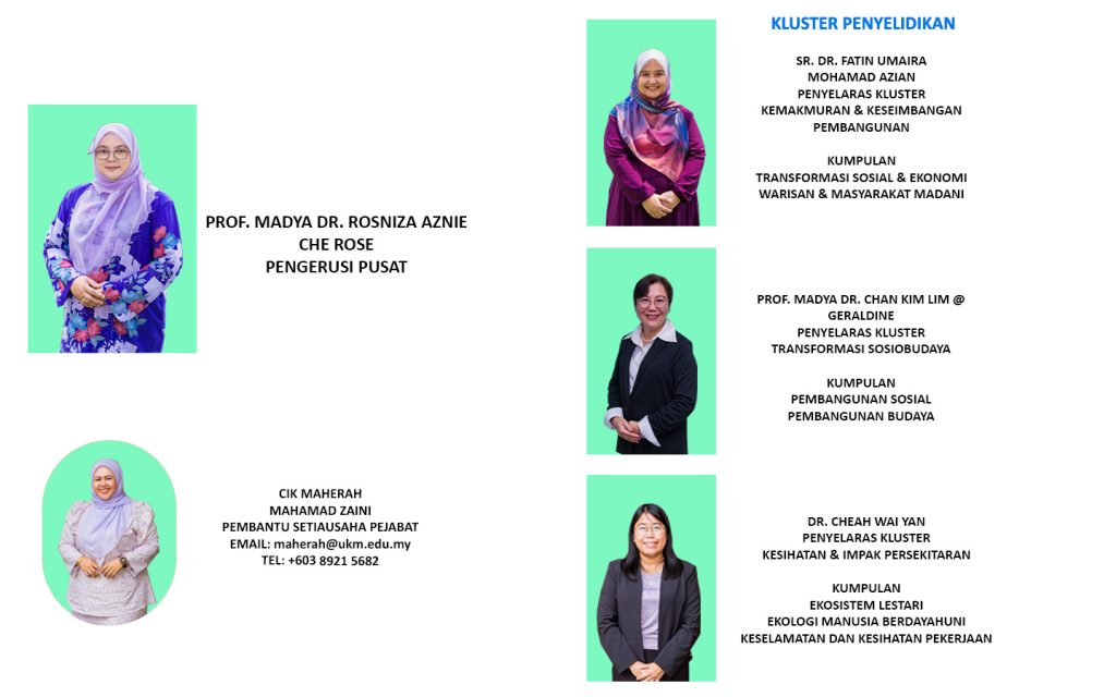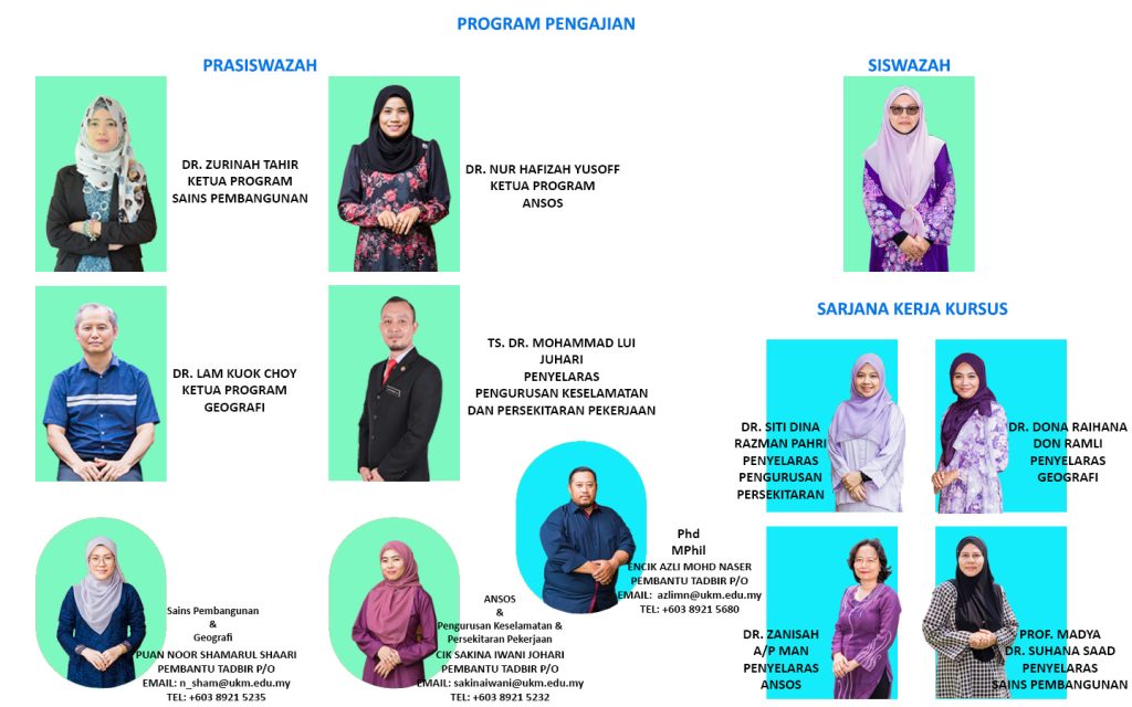 ADMINISTRATION Pengurusan Pusat Kajian Pembangunan, Sosial dan Persekitaran (SEEDS) Prof. Madya Dr. Rosniza Aznie Che RosePengerusi SEEDS Kluster Penyelidikan Sr. Dr. Fatin Umaira Mohamad AzianPenyelaras Kluster Kemakmuran dan Keseimbangan dan PembangunanKumpulanTransformasi Sosial dan Ekonomi Warisan dan Masyarat Madani Prof. Madya Dr. Chan Kim Lim @ GeraldinePenyelaras Kluster Transformasi SosiobudayaKumpulanPembangunan Sosial dan Pembangunan Budaya Dr. Cheah Wai YanPenyelaras Kluster Kesihatan dan Impak PersekitaranKumpulanEkosistem LestariEkologi Manusia BerdayahuniKeselamatan dan Kesihatan Pekerjaan Program Pengajian Prasiswazah Dr. Zurinah TahirKetua Program Sains Pembangunan Dr. Nur Hafizah YusoffKetua Program Antropologi dan Sosiologi Dr. Lam Kuok ChoyKetua Program Geografi Ts. Dr. Mohammad Lui JuhariPenyelaras Pengurusan Keselamatan dan Persekitaran Pekerjaan Siswazah Prof. Madya Dr. Zaimah RamliKetua Program Siswazah Sarjana Kerja Kursus Dr. Siti Dina Razman PahriPenyelaras Pengurusan Persekitaran Dr. Dona Raihana Don RamliPenyelaras Geografi Dr. Zanisah a/p ManPenyelaras Antropologi & Sosiologi Prof. Madya Dr. Suhana SaadPenyelaras Sains Pembangunan