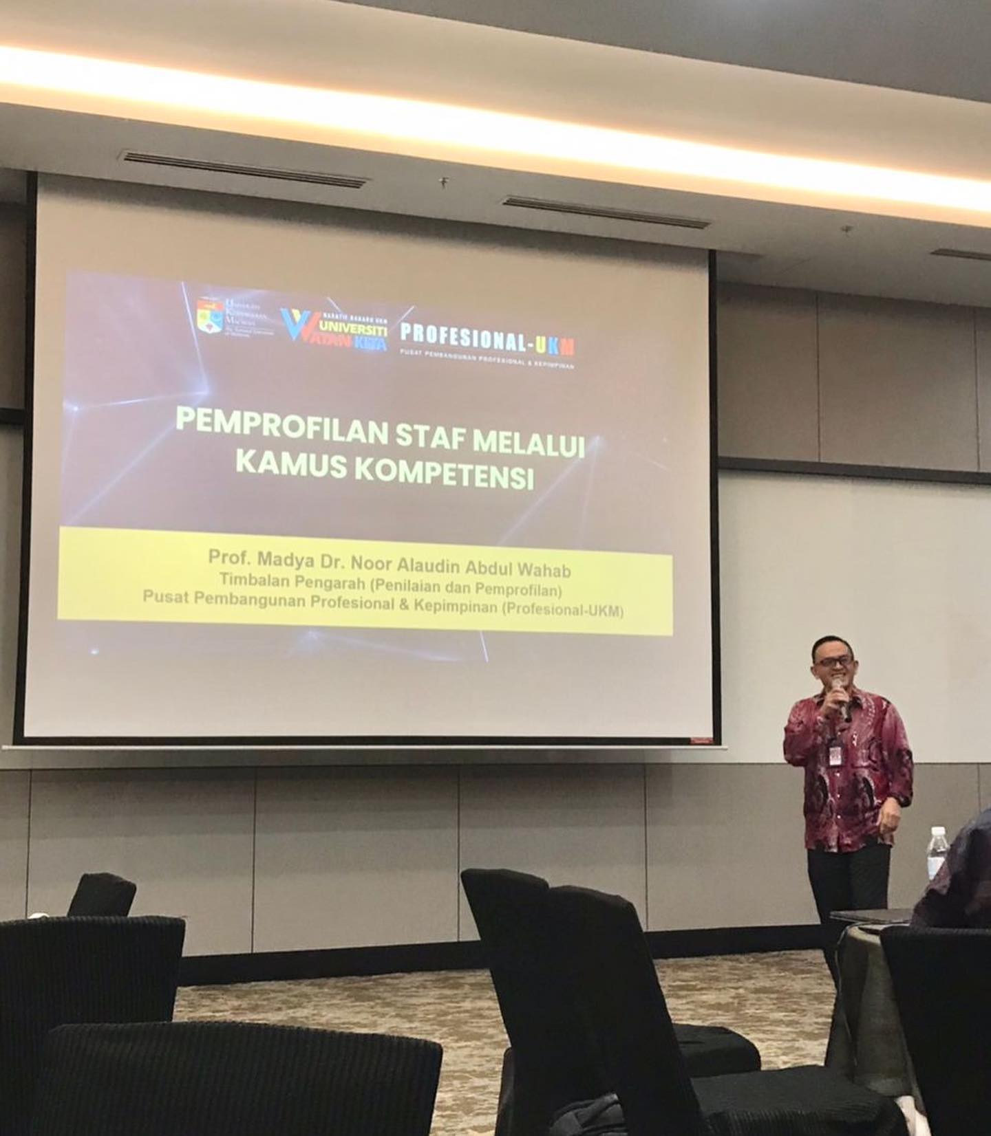 Profesional-UKM telah diwakili oleh Prof. Madya Dr. Noor Alaudin Abdul Wahab, Timbalan Pengarah (Penilaian & Pemprofilan) telah membentangkan perkara berkaitan pengurusan bakat berasaskan kompetensi serta pembangunan kamus dan model kompetensi sehingga kaedah penilaian dan pemprofilan kompetensi.