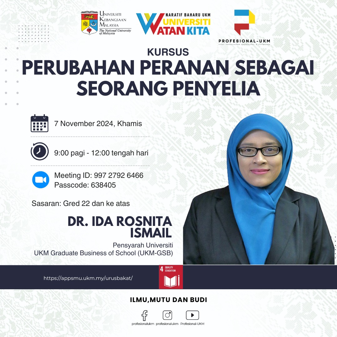 Kursus Perubahan Peranan Sebagai Seorang Penyelia direka untuk membekalkan peserta dengan pengetahuan dan kemahiran yang diperlukan untuk beralih daripada peranan biasa kepada peranan penyelia yang lebih bertanggungjawab dan berkesan. Kursus ini memberi tumpuan kepada aspek-aspek penting dalam pengurusan, kepimpinan, dan komunikasi yang diperlukan untuk menjadi penyelia yang berjaya, serta cara untuk menyesuaikan diri dengan perubahan yang datang bersama tanggungjawab baru tersebut.