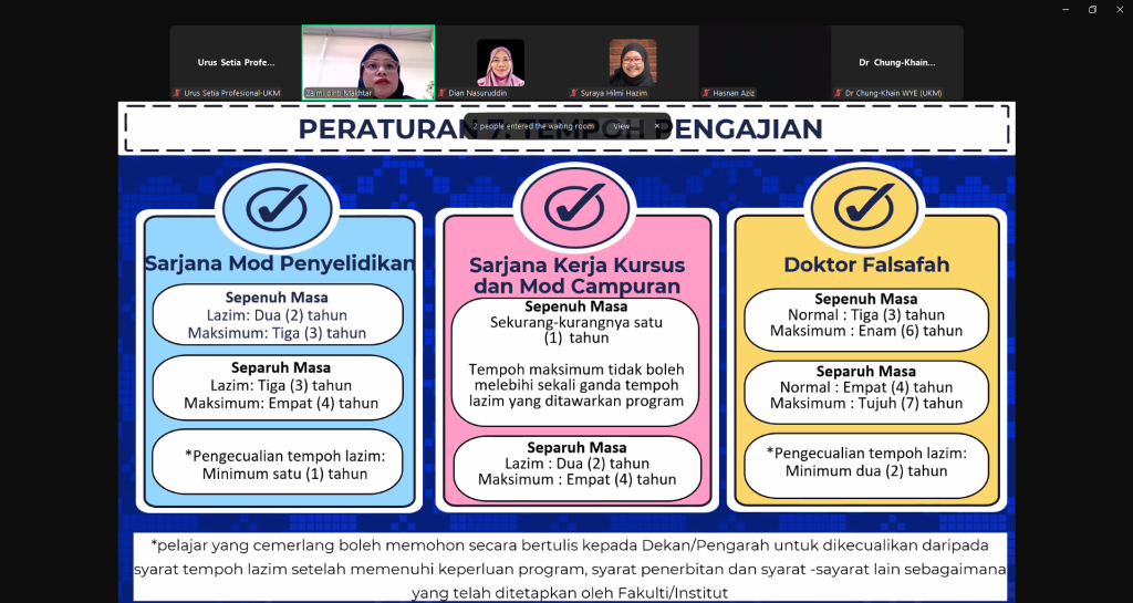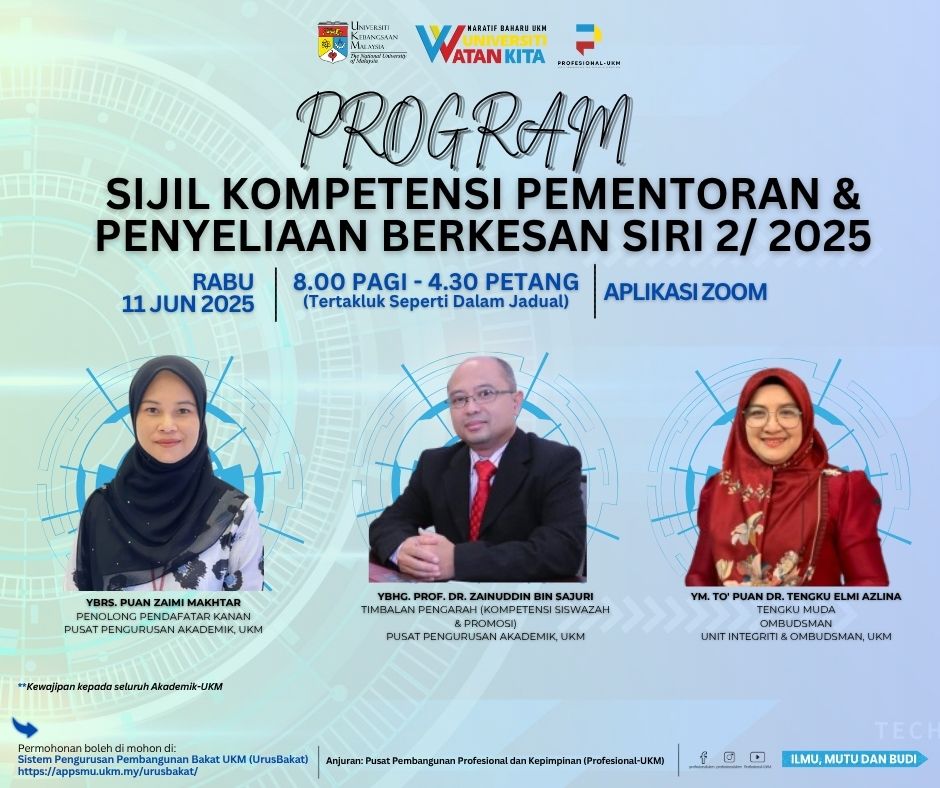 Untuk permulaan tahun 2025, sebanyak 3 siri program Sijil Kompetensi Pementoran dan Penyeliaan Berkesan dirancangkan untuk ditawarkan kepada tenaga akademik UKM yang masih belum menyertai program ini sebagai salah satu syarat bagi memenuhi keperluan MQA khususnya dalam aspek pengajaran dan penyeliaan. Merangkumi tiga modul wajib iaitu Peraturan dan Pengurusan Siswazah, Peranan dan Tanggungjawab Penyeliaan dan Etika dan Integriti Penyeliaan. Tempoh pelaksanaan program dilaksanakan dalam tempoh satu (1) hari dan boleh dilaksanakan secara bersemuka atau dalam talian dan boleh ditawarkan secara kolaborasi dengan mana-mana Fakulti/Pusat/Institut bersama Profesional-UKM.