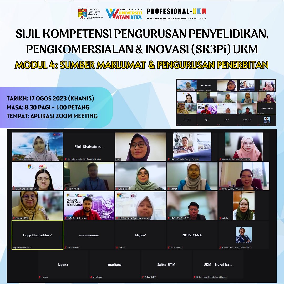 Pada 17 Ogos 2023, program SK3Pi diteruskan dengan Modul 4 iaitu Sumber Maklumat dan Pengurusan Penerbitan yang telah disampaikan oleh Puan Norliah Sukarno, Puan Shaizimah Badzri dan Cik Mariati Embong dari Perpustakaan Tun Seri Lanang (PTSL). Dalam modul ini, peserta diperkenalkan sumber maklumat berkualiti dan pengurusan penerbitan bagi keperluan penyelidikan. Tumpuan utama adalah untuk membina kemahiran mengakses sumber maklumat perpustakaan dan mengenalpasti sumber penerbitan berindeks serta keperluan pendaftaran penerbitan dalam sistem repositori penerbitan.