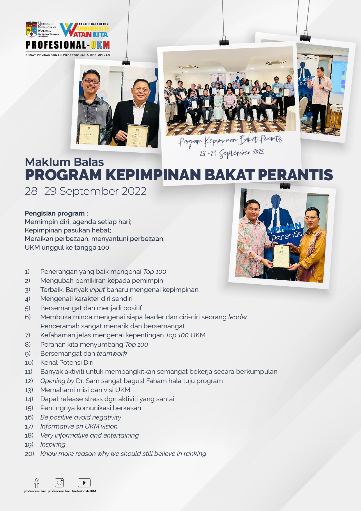 Tahniah dan syabas kepada peserta Program Kepimpinan BAKAT Perantis Kohort 1 Tahun 2022 yang telah berjaya memperoleh Sijil Kepimpinan Bakat Perantis.