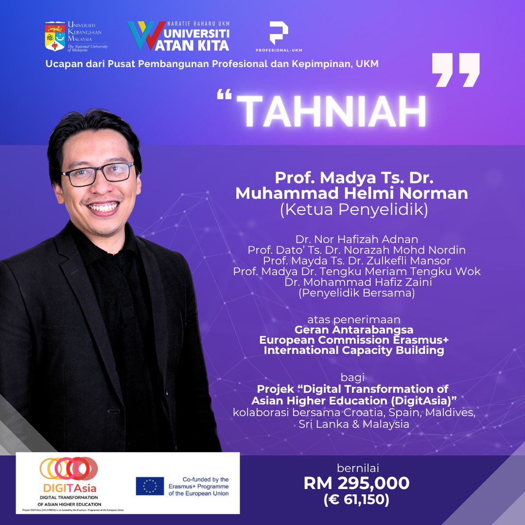 Pusat Pembangunan Profesional & Kepimpinan mengucapkan setinggi tahniah kepada Prof Madya Ts Dr Muhammad Helmi Norman (Pengarah, Profesional-UKM) sebagai Ketua Penyelidik serta ahli penyelidik, Prof Dato’ Ts Dr Norazah Mohd Nordin (Pengarah, UKM ISN-SDG), Prof Madya Ts Dr Zukefli Mansor (Pengarah, Pengajaran-UKM), Prof Madya Dr Tengku Siti Meriam Tengku Wok (Ketua KPU Teknologi Pembelajaran & Tingkah Laku Manusia), Dr Nor Hafizah Adnan (Pensyarah Kanan Pembelajaran Imersif, FPend) & Dr Mohammad Hafiz Zaini (Ketua DPLI & Sarjana Eksekutif, FPend) atas geran antarabangsa European Union Erasmus+ kolaborasi bersama Croatia, Spain, Maldives, Sri Lanka, & Malaysia berjumlah 61,150 EUR (RM295,000).