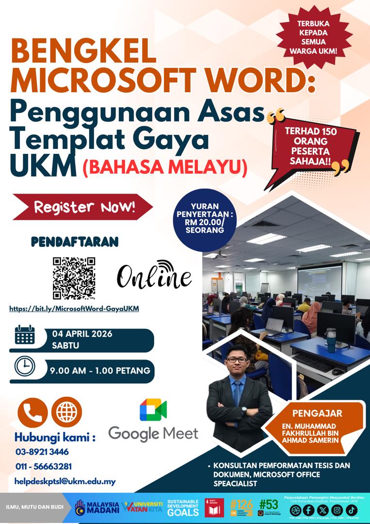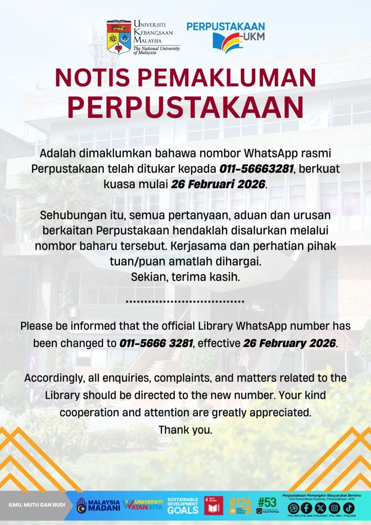 +603-89213446 – Perkhidmatan Perundingan 0129518875 –Khidmat Pelanggan 011-5666 3281 – Telegram/Whatsapp Email: helpdeskptsl@ukm.edu.my