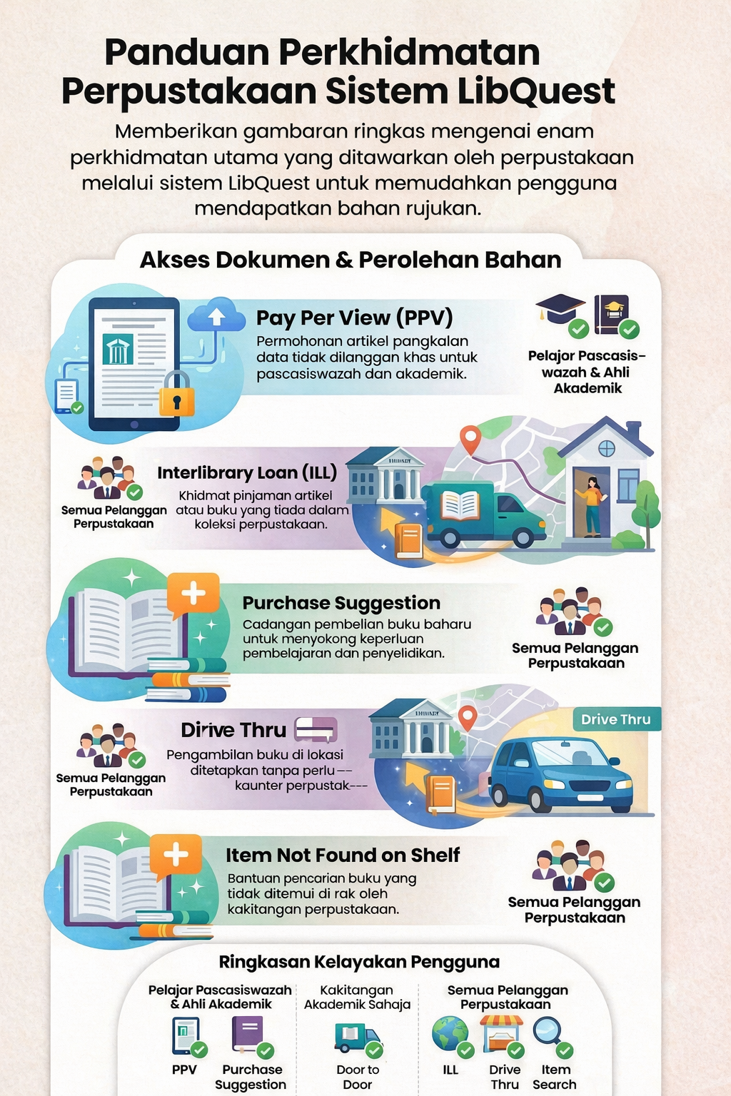 - Users may submit their requests via the LibQuest system at https://libquest.ukm.my.