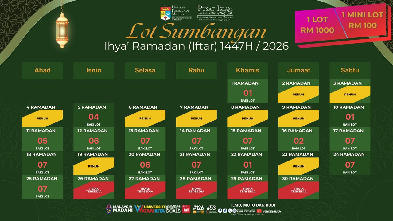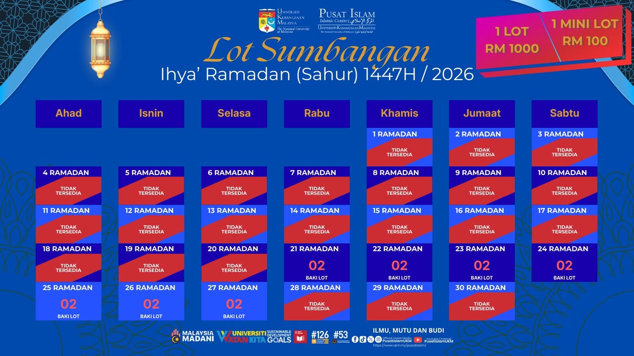 1) Melalui No. Akaun Rasmi CIMB Bank Universiti Kebangsaan Malaysia iaitu (98945110502000) dan Ref: Sumbangan Ihya’ Ramadan 2026