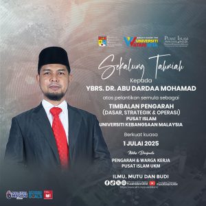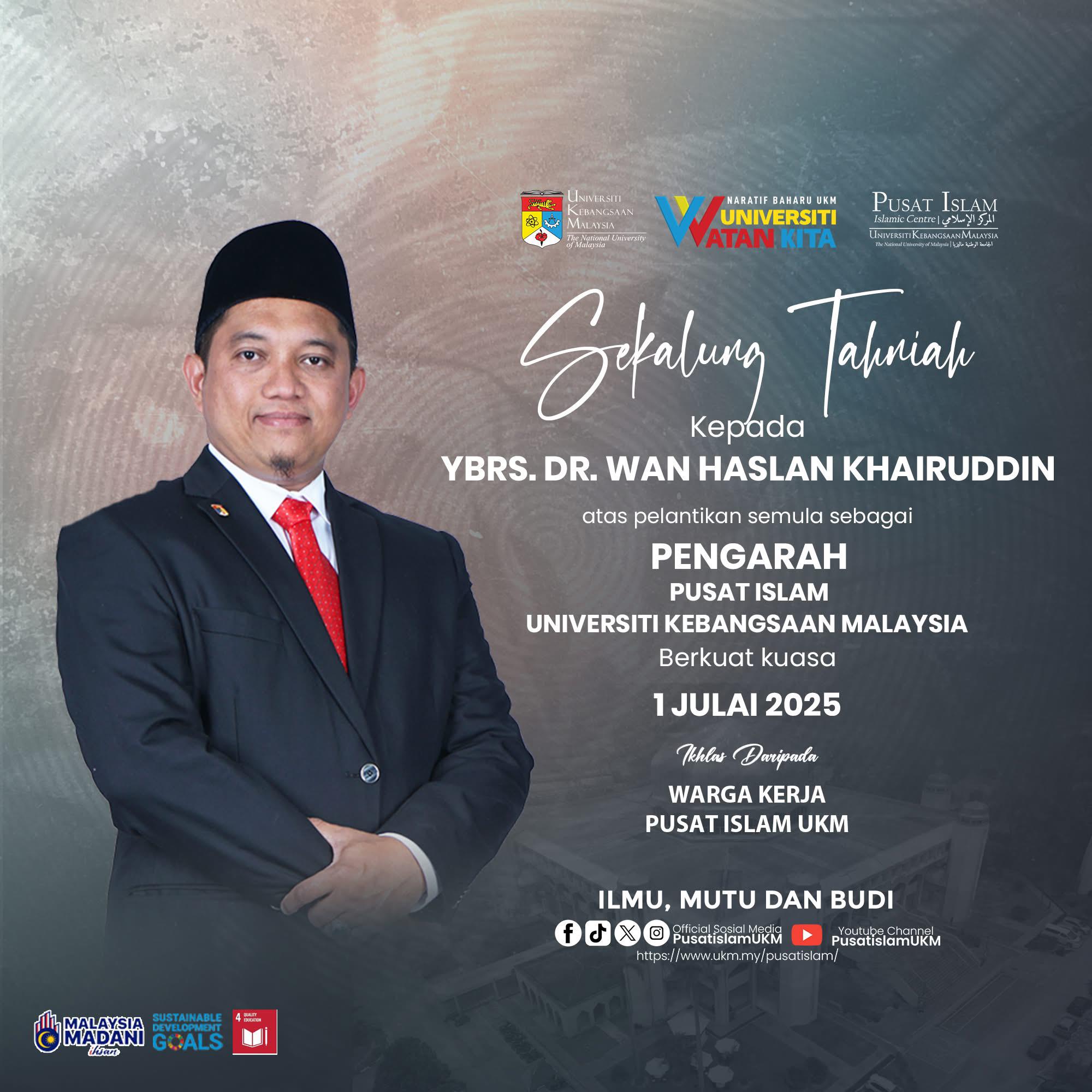 Tahniah kepada YBrs Dr. Wan Haslan Khairuddin, atas pelantikan semula sebagai Pengarah dan YBrs Dr. Abu Dardaa Mohamad, atas pelantikan semula sebagai Timbalan Pengarah (Dasar, Strategik & Operasi), Pusat Islam UKM berkuat kuasa mulai 1 Julai 2025.
