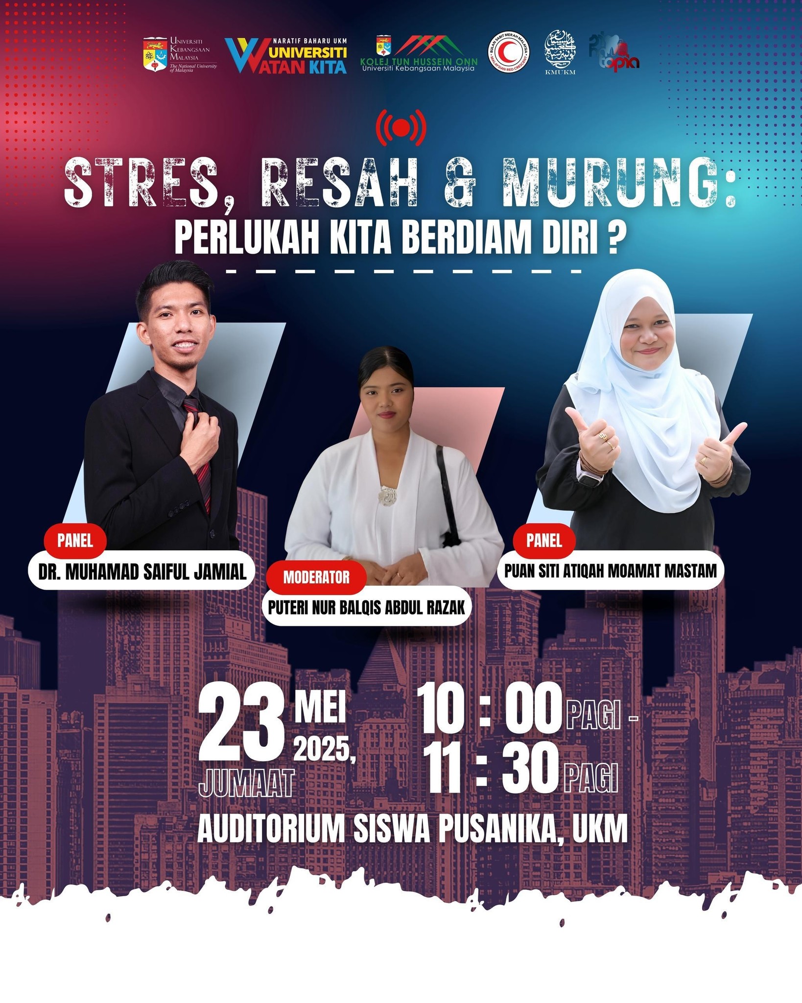 Pegawai Perubatan PKU, Dr Muhamad Saiful b Jamial telah menerima jemputan sebagai panel forum kesihatan sempena program SIHATOPIA anjuran BSMM Kolej Tun Hussein Onn pada 23 Mei 2025 bertempat di Auditorium Pusanika UKM dengan tajuk Stres, Resah, Murung: Perlukah Kita Berdiam Diri.