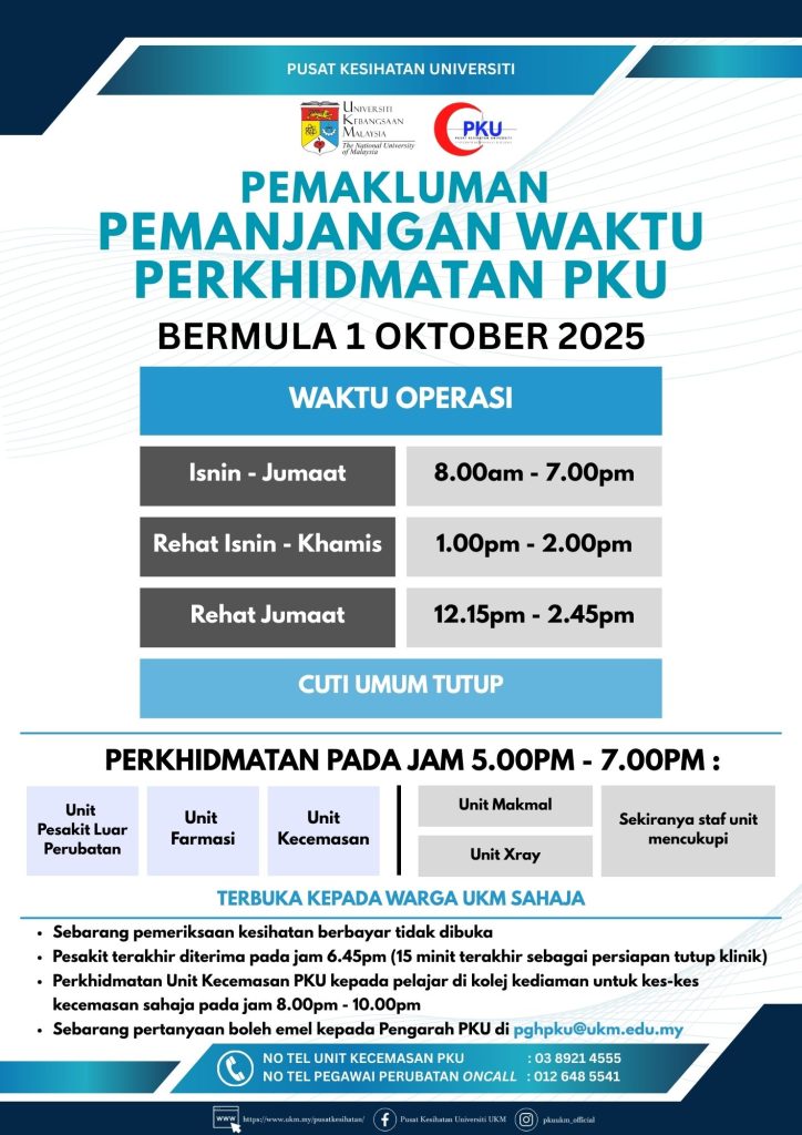 Pemakluman pemanjangan waktu perkhidmatan Pesakit Luar Pusat Kesihatan Universiti sehingga jam 7.00 malam akan bermula pada 1 Oktober 2025.