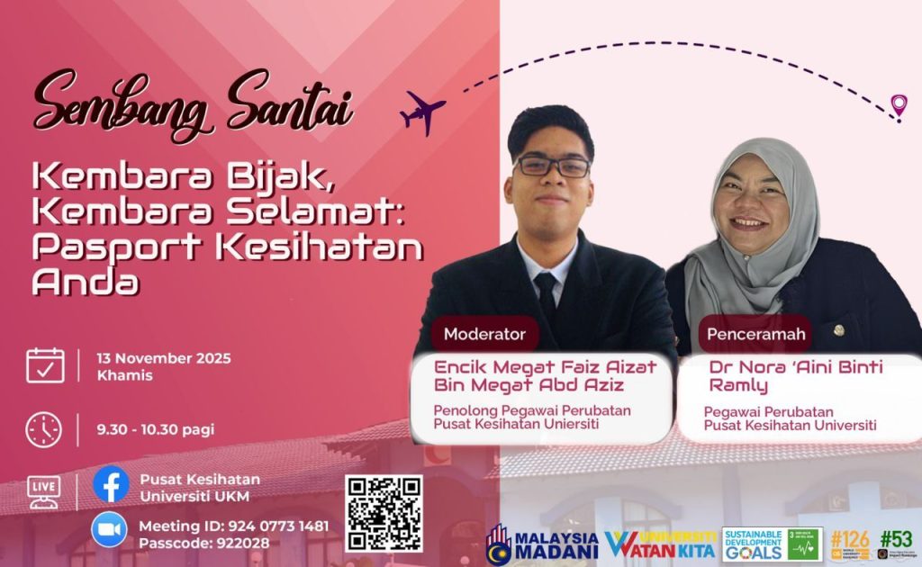 Tempat : Secara langsung di Zoom Meeting dan Facebook Rasmi Pusat Kesihatan Universiti UKM