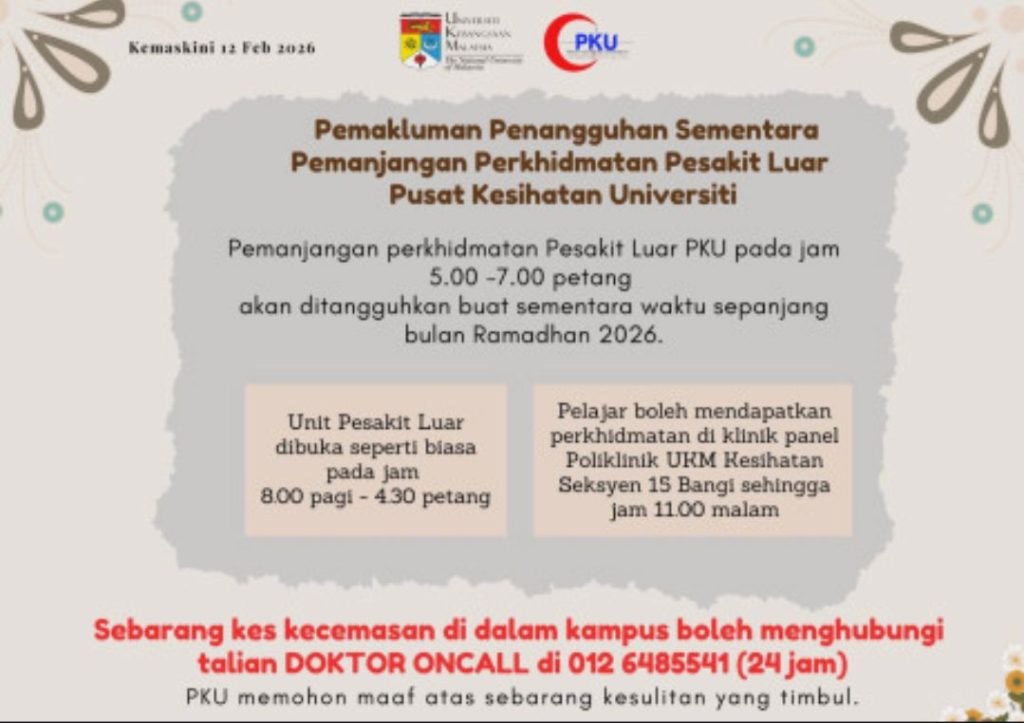 Warga kampus boleh mendapatkan perkhidmatan di Klinik Panel Poliklinik UKM Kesihatan sehingga jam 11.00 malam.