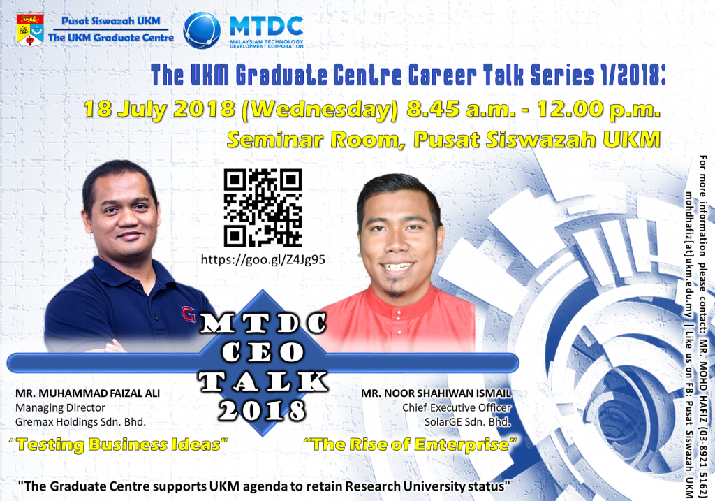 The UKM Graduate Centre is pleased to invite you to join The UKM Graduate Centre Career Talk Series 1/2018: MTDC CEO Talk 2018