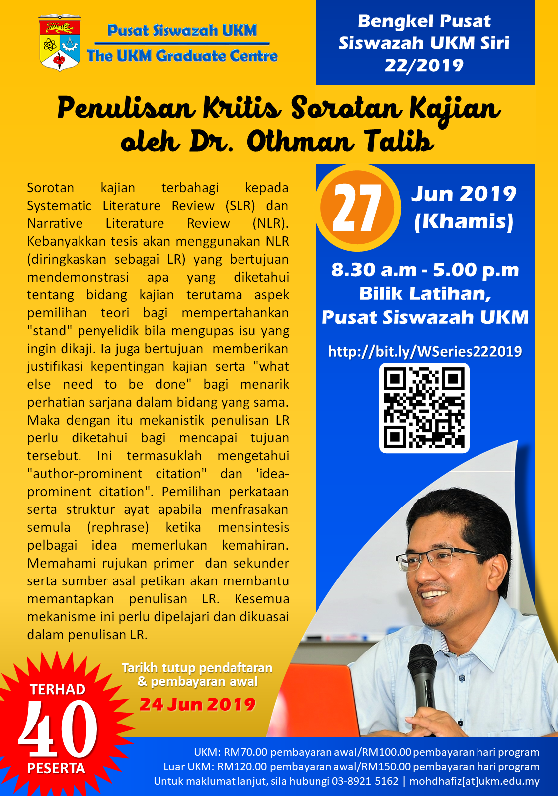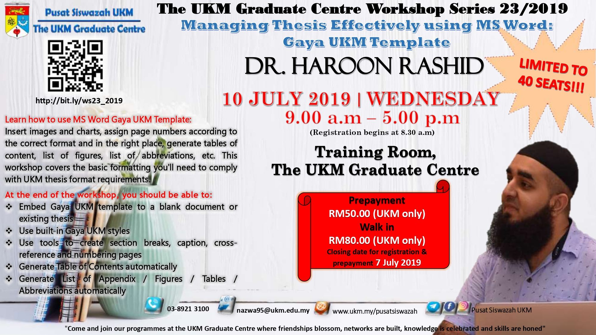 Sukacita kami menjemput saudara/i untuk menyertai program kami. Butiran program seperti berikut: ? *27 Jun 2019 (Khamis)* ⏰ *8.30 pagi – 5.00 petang* ? *Bilik Latihan, Pusat Siswazah…