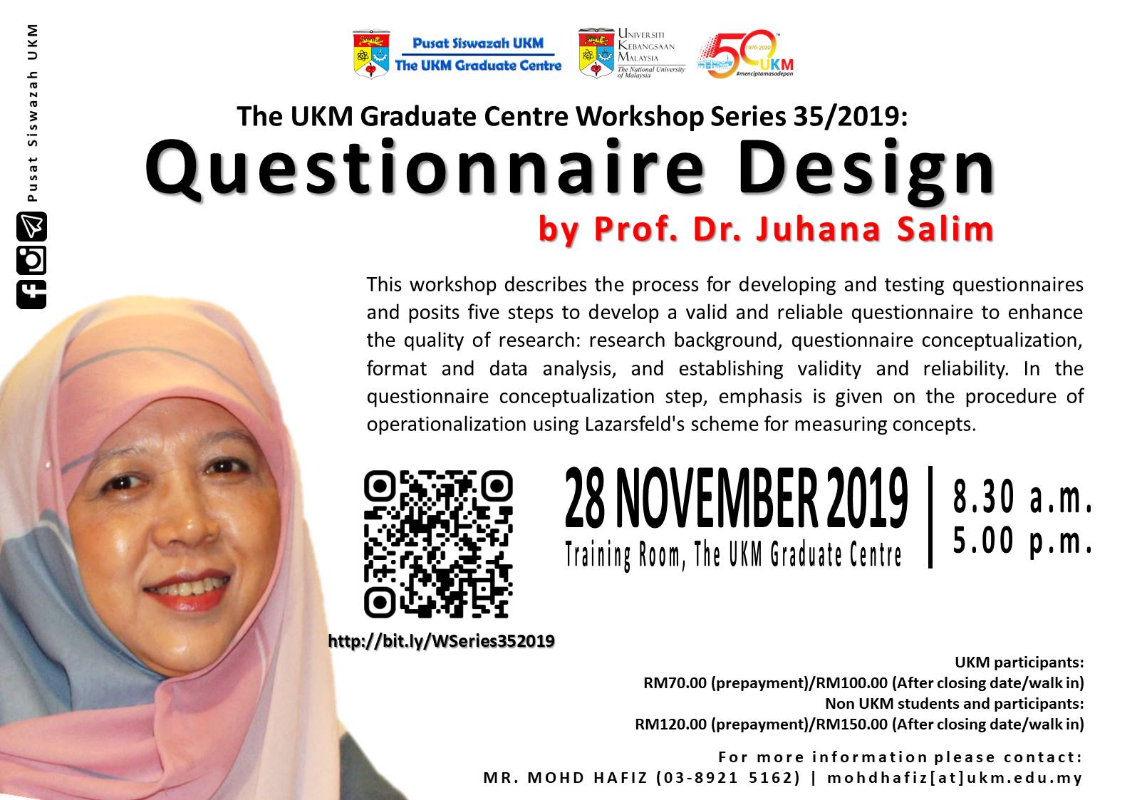 Bengkel Pusat Siswazah UKM Siri 35/2019: Questionnaire Design Sukacita kami menjemput saudara/i untuk menyertai program kami. Butiran program seperti berikut: ? 28 November 2019 (Khamis) ⏰ 8.30…