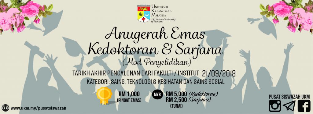 Fakulti/Institut dijemput untuk mengemukakan pencalonan bagi Anugerah Emas Kedoktoran dan Anugerah Emas Sarjana kepada pihak urus setia. Semua Fakulti/Institut perlu mencalonkan hanya seorang penama sahaja untuk kategori Kedoktoran dan Sarjana mengikut bidang yang berkaitan sahaja.