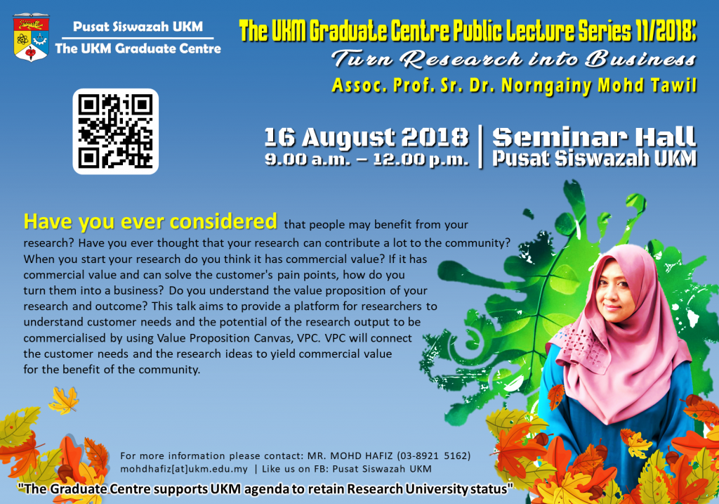 The UKM Graduate Centre is pleased to invite you to attend The UKM Graduate Centre Public Lecture Series 11/2018: Turn Research into Business by Assoc. Prof. Sr. Dr. Norngainy Mohd Tawil from Centre of Entrepreneurship and SMEs Development (CESMED).