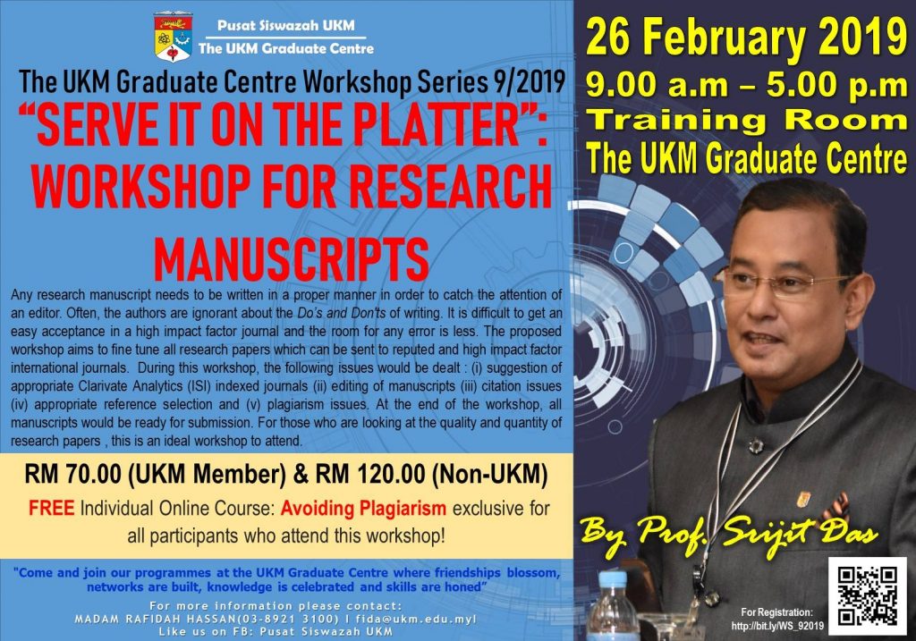 The UKM Graduate Centre is pleased to invite you to join The UKM Graduate Centre Workshop Series 9/2019: “Serve It On the Platter”: Workshop for Research Manuscripts.
