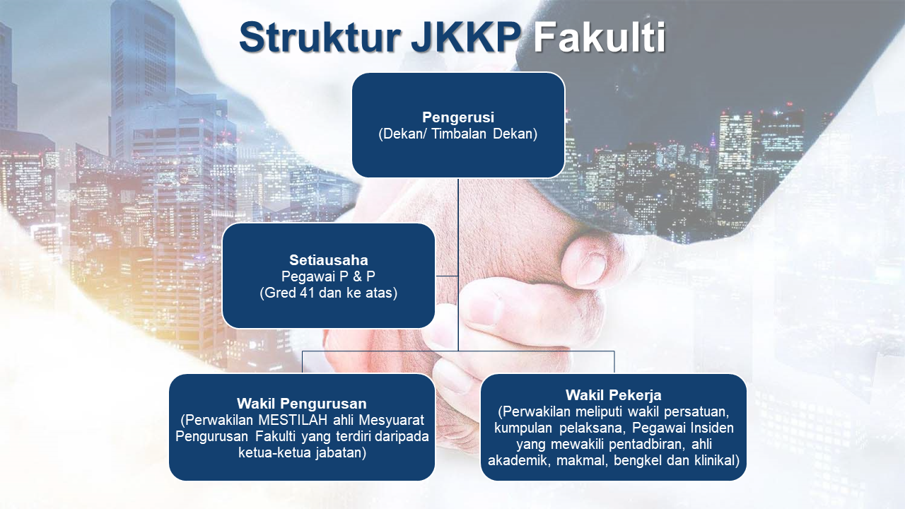 Jawatankuasa Keselamatan dan Kesihatan Pekerjaan Fakulti (JKKP-Fakulti) adalah bertugas sebagai badan penasihat kepada Dekan/Pengarah dalam hal pengawasan keselamatan di fakulti dan pelaksanaan dasar keselamatan Universiti. JKKP-Fakulti ini juga perlu membantu Jawatankuasa Keselamatan dan Kesihatan Pekerjaan UKM (JKKP-UKM) dalam melaksanakan fungsi-fungsi berkaitan keselamatan dan kesihatan dan kegiatan lain untuk menggalakkan dan mematuhi perjalanan kerja yang selamat dan sihat. Jawatankuasa ini dianggotai oleh:
