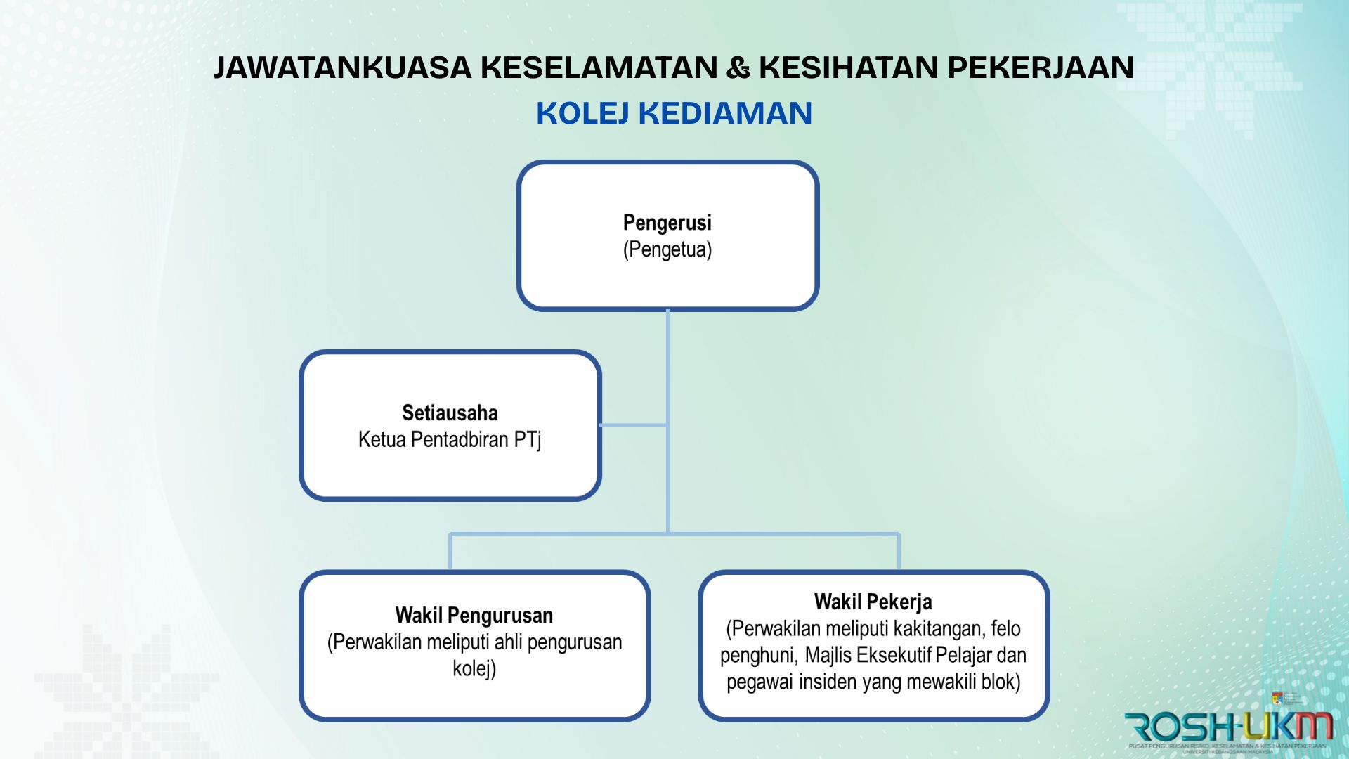 Jawatankuasa Keselamatan dan Kesihatan Pekerjaan Kolej Kediaman (JKKP-Kolej) bertanggungjawab dalam hal pengawasan keselamatan di kolej dan pelaksanaan dasar keselamatan Universiti. JKKP-Kolej juga perlu membantu Jawatankuasa Keselamatan & Kesihatan Pekerjaan UKM (JKKP-UKM) dalam melaksanakan fungsi-fungsi berkaitan keselamatan, kesihatan dan kegiatan lain untuk menggalakkan dan memastikan pelajar berada dalam keadaan selamat dan sihat. Jawatankuasa ini dianggotai oleh: