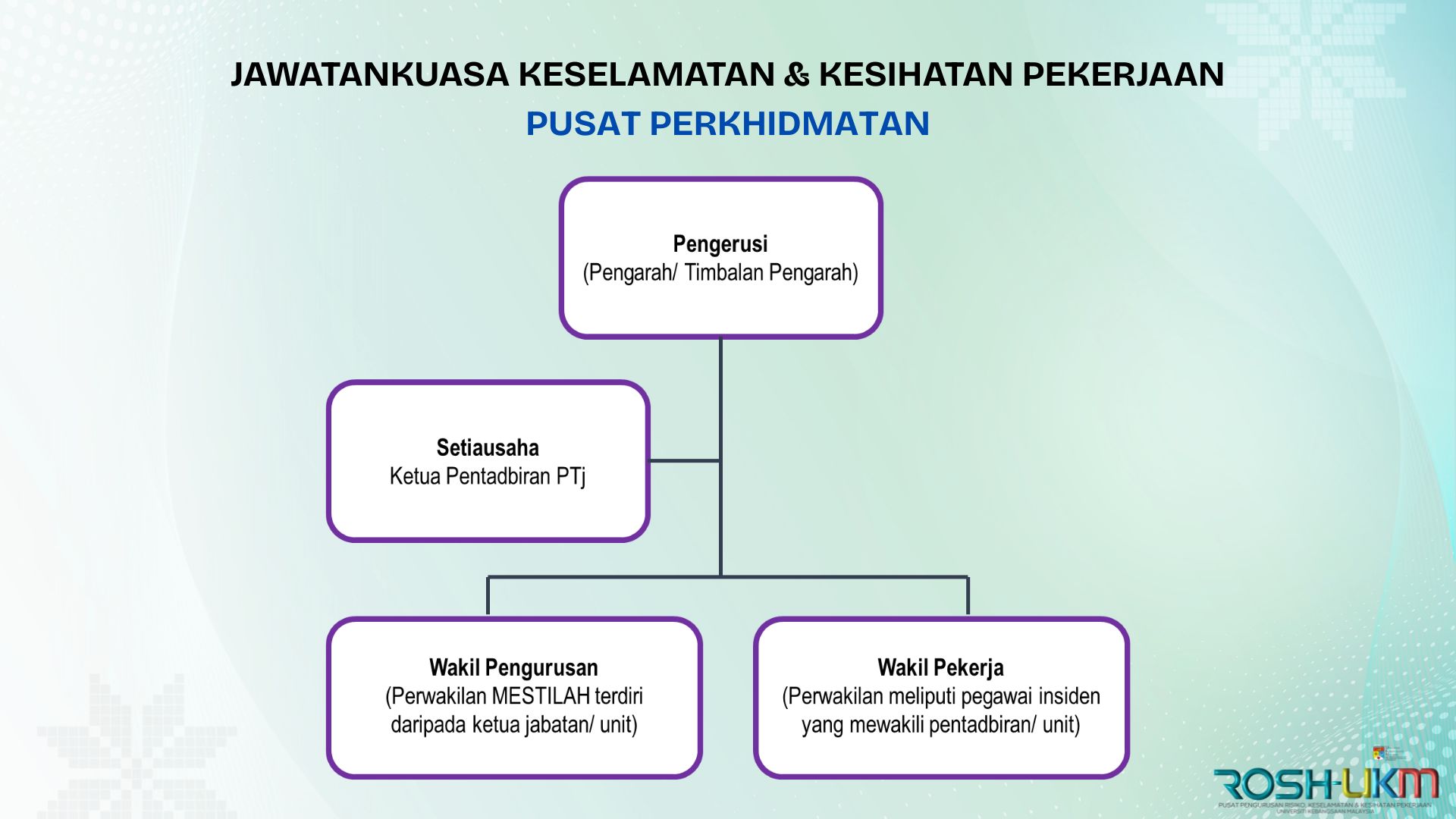 Jawatankuasa Keselamatan dan Kesihatan Pekerjaan Pusat Perkhidmatan (JKKP-Pusat) bertanggungjawab dalam hal pengawasan keselamatan di pusat perkhidmatan dan pelaksanaan dasar keselamatan Universiti. JKKP-Pusat juga perlu membantu Jawatankuasa Keselamatan & Kesihatan Pekerjaan UKM (JKKP-UKM) dalam melaksanakan fungsi-fungsi berkaitan keselamatan, kesihatan dan kegiatan lain untuk menggalakkan dan memastikan kakitangan berada dalam keadaan selamat dan sihat. Jawatankuasa ini dianggotai oleh: