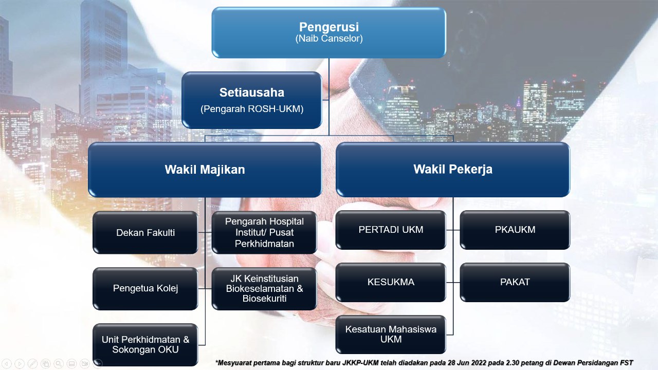 - Menghadiri mesyuarat Jawatankuasa Keselamatan dan Kesihatan Pekerjaan – Universiti Kebangsaan Malaysia (JKKP-UKM) yang diadakan tidak kurang daripada tiga bulan sekali. (Peraturan 21).