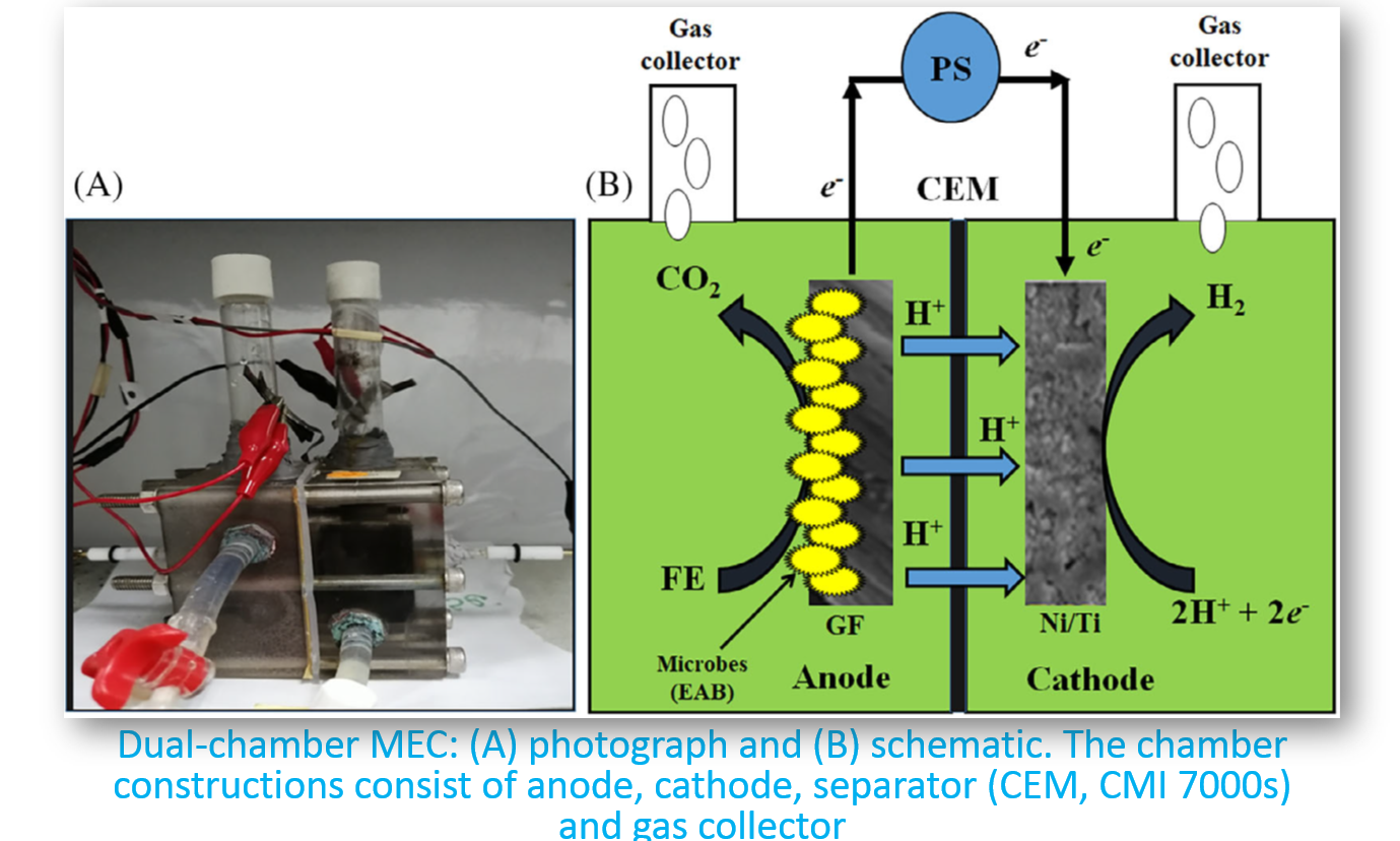 It is undeniable that hydrogen is considered as one of the possible pathways to low carbon energy future. Microbial electrolysis cell (MEC) is studied and used to produce hydrogen in our laboratory. The MEC is meant to reduce the operational cost in producing hydrogen compared to conventional water electrolysis. Electrical energy recovered from microbial oxidation activities at anode is channelled to cathode for hydrogen evolution. Both biotic and abiotic cathodes are studied in this system.